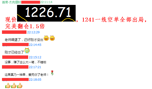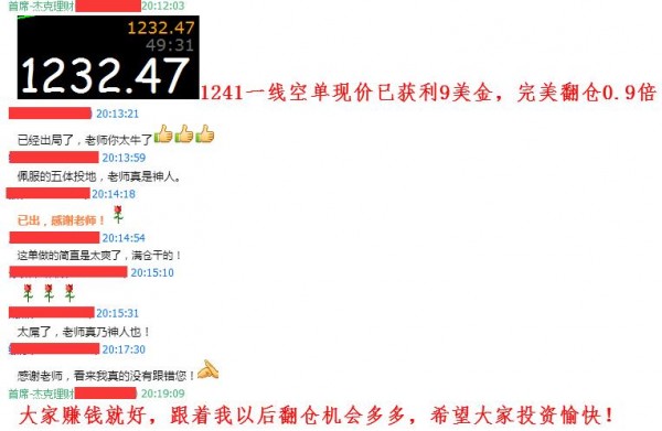 現價1226.71一線,1241滿倉空單,完美翻倉1.5倍! 跟上節奏: 一萬美金現在是25000美金,RMB170000元。 五萬美金現在是125000美金,RMB850000元。一百萬美金現在2500000美金,RMB17000000元。 翻倉布局仍在繼續沒跟上的節奏的朋友,加快你們的步伐,跟上腳步,早日翻倉! 1:我們沒有模糊的區間,只有精確的做單點位。 2:沒有百分百的準確,只有穩定的盈利。 3: 沒有爾虞我詐,只有一顆真誠的心。 4: 只要讓客戶長期的收益,我們才能長期的合作,這才是王道。 |