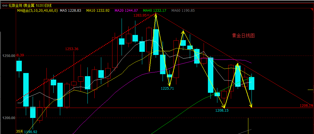 當前大方向,價格一直在趨勢線下方震蕩式下跌,高點不斷降低,低點不斷下移,整體思路上繼續(xù)保持看空不變,震蕩式下跌,而不是單邊下跌,下方1190是必須要見到的。下方重要的分水嶺是1208,價格維持在1208上方,則行情將是震蕩,向上突破1235,并順勢突破1245,則有望到達1260,但月線上來看,并不看好價格直接突破1283。價格下方跌破1208,則行情將進一步看空,價格將跌到我說的1190位置,若破位1190,則將到達1046上升到1283的0.50位置1165和0.618位置1136。