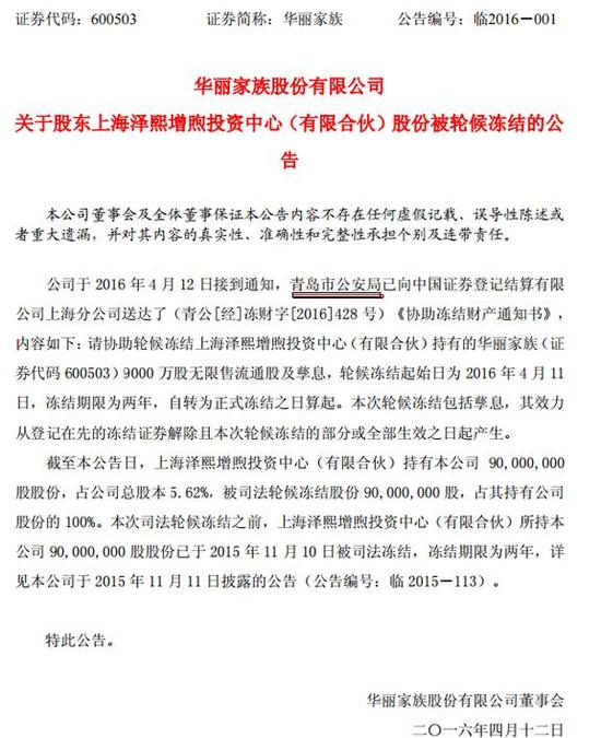 4月12日晚間,微信公眾號私募風云爆料,接到可靠消息人士密報:徐翔案即將開庭審理,主審方是青島市法院。 4月12日,華麗家族發布的關于澤熙所持股份被凍結的公告中出現“青島市公安局”的身影! 相關新聞:起底徐翔 草根起家 操盤兇猛 幾萬元炒股起家,20多歲成為“寧波漲停敢死隊舵主”,此前救市行動中與證金操盤“巧合” 18歲放棄高考,拿著父母給的幾萬塊錢成為專職投資人,20歲出頭即成為“寧波漲停敢死隊舵主”,徐翔在中國資本市場成名已久。然而他為人卻十分低調,幾乎不出席公眾活動,網上也幾乎沒有他的照片,對于外界的質疑他也不予理會。當他此次被抓時,業界還以為又是新一輪的傳言。 營業部成名的“草根股民” 提起徐翔被抓,私募界更多的是同情與惋惜。“其實我很為大佬不平,白手起家到今天不容易!”一位私募界人士感嘆道。 徐翔一直被人看成“草根英雄”,他生于1978年,在中國證券報的一次采訪中,徐翔透露自己從上世紀90年代中期開始入市炒股,當時只是一個高中生,家境非常普通,入市時只有幾萬元啟動資金。 寧波銀河證券解放南路營業部是徐翔的起家之地,到了90年代末,徐翔已經成為了赫赫有名的“寧波漲停敢死隊舵主”。市場傳言,在寧波的幾年,徐翔至少獲利20億。2005年,徐翔從寧波遷至上海發展,經歷了A股的一波大牛市。四年后,他成立了上海澤熙投資管理有限公司。2010年3月5日,澤熙1期成立,此后澤熙開始密集現身上市公司前十大流通股東。 有熟悉徐翔的人士表示,一直以來外界對徐翔的業績有諸般猜測,但徐翔本人確實對市場有著驚人的專注,徐翔對股市有著強烈的熱情,股市就是他最大的愛好。 在澤熙,徐翔并非單打獨斗,他高薪聘請大量研究員,幫助他篩選個股,獲取市場信息,其中不乏媒體記者出身的研究員。但最終的投資決策均由徐翔本人做出。在一次采訪中,他說:“我學習股票,看書,聽券商培訓,也看國外投資方法。三人行必有我師,對宏觀經濟,也懂一點。” 然而,也有人質疑說,徐翔旗下基金如此高的業績,光靠正常的調研、分析是不可能達到的。(和訊股票) 相關新聞:徐翔案再發酵:9000萬股華麗家族股份被輪候凍結 昔日“私募一哥”徐翔被查案再度發酵,旗下公司所持有的華麗家族(600503)股份再遭輪候凍結。 4月12日,華麗家族公告,青島市公安局已向中國證券登記結算有限公司上海分公司送達了《協助凍結財產通知書》,請協助輪候凍結上海澤熙增煦投資中心(有限合伙)持有的華麗家族9000萬股無限售流通股及孳息,輪候凍結起始日為2016年4月11日,凍結期限為兩年,自轉為正式凍結之日算起。截至4月11日,該部分股權市值90180萬元。 截至目前,上海澤熙增煦投資中心(有限合伙)持有華麗家族9000萬股股份,占總股本5.62%。此次司法輪候凍結之前,上海澤熙增煦投資中心(有限合伙)所持本公司9000萬股份已于2015年11月10日被司法凍結,凍結期限為兩年。 所謂輪候凍結,就是對其他執行法院已經查封、扣押、凍結的有登記的財產,執行法院可以進行輪候查封、扣押、凍結登記。查封、扣押、凍結撤銷或者解除的,登記在先的輪候查封、扣押、凍結即自動轉為查封、扣押、凍結”。如果通俗一點,不妨理解為“多個債主上門,討債輪流來”。 2015年11月1日,新華社報道稱,澤熙投資管理有限公司法定代表人、總經理徐翔等人通過非法手段獲取股市內幕信息,從事內幕交易、操縱股票交易價格,其行為涉嫌違法犯罪,已經被公安機關依法采取刑事強制措施。 此后,澤熙系多家公司股權被凍結,高管失聯,徐翔一批心腹也集體離職。(澎湃新聞) |