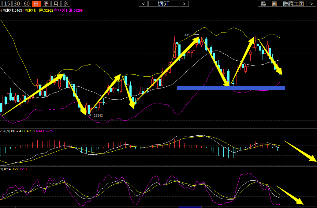 日線來看,價格企穩與布林下軌并繼續向下運行,布林帶正逐步收口,均線系統整體死叉運行,上方受5日均線壓制,指數平滑異同平均線macd死叉運行,綠色能量柱逐步放量,隨機指標kdj死叉運行至超賣區。 5.9銅交易策略