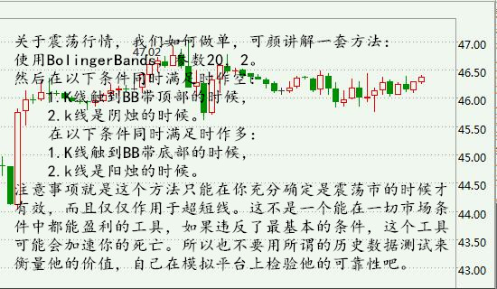 注意事項就是這個方法只能在你充分確定是震蕩市的時候才有效,而且僅僅作用于超短線。這不是一個能在一切市場條件中都能盈利的工具,如果違反了最基本的條件,這個工具可能會加速你的死亡。所以也不要用所謂的歷史數據測試來衡量他的價值,自己在模擬平臺上檢驗他的可靠性吧。