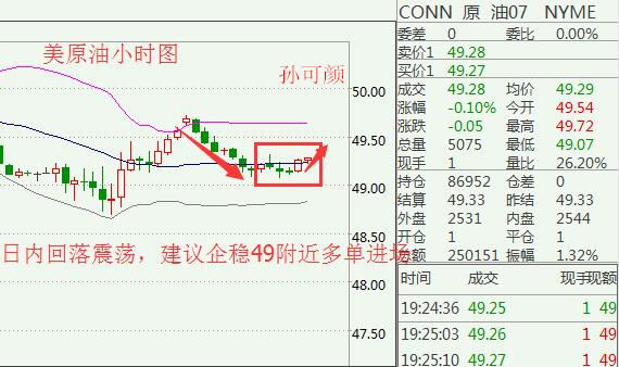早上已經表明了今天的總體思路,今天操作大體思路就是先看好下跌,美盤看漲,就是先跌后漲的行情,操作上是先做空油價,早間的空已經把握在手,現在沒單子就觀望,49美元附近的時候做多即可。