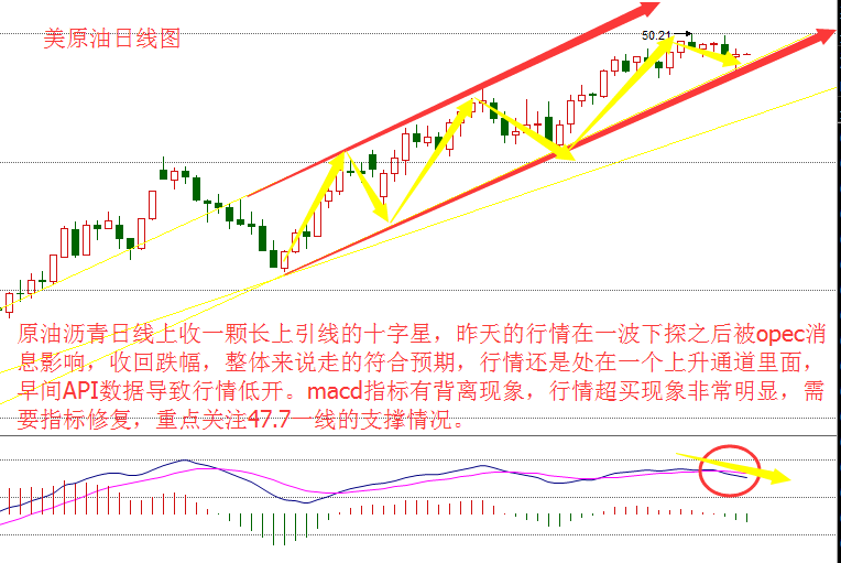 今天是本周超級周里面還有一個超級交易日,今天的重頭戲在晚間的小非農,EIA和OPEC會議,據分析歐佩克更關注市場份額,而不是支撐油價,國際油價在每桶50美元附近遭遇到了強勁阻力。會議雖然很難達成目標但是對油價的影響不容小覷。自上次4月17日多哈動產會議到現在油價已經上漲11美元。歐洲央行利率決議、德拉基記者會,美聯儲褐皮書都在今天集中公布,行情比較快。請各位投資者做好風險控制。 美國WTI原油7月期貨周三(6月1日)收跌0.09美元,或0.18%,報49.01美元/桶。布倫特原油7月期貨周三收跌0.17美元,或0.34%,報49.72美元/桶。油價日內一度下挫逾1%,但隨著市場傳聞石油輸出國組織(OPEC)將于明日會議上考慮設置產量上限,油價獲得有效提振并一度轉至平盤附近,同時美元回落也為油價提供了一定支撐。美國WTI原油期貨價格盤中最低觸及47.76美元/桶,布倫特原油期貨價格盤中最低觸及48.66美元/桶。 美國石油協會(API):上周美國原油庫存增加近240萬桶,美國至5月27日當周原油進口上升73.1萬桶/日至800萬桶/日。此外,上周API汽油庫存減少148.5萬桶,預估為減少70萬桶;上周API精煉油庫存減少115.6萬桶,預估為減少70萬桶。美國當周API數據公布后,美油布油短線下挫。 行情分析 原油瀝青日線上收一顆長上引線的十字星,昨天的行情在一波下探之后被opec消息影響,收回跌幅,整體來說走的符合預期,行情還是處在一個上升通道里面,早間API數據導致行情低開。macd指標有背離現象,行情超買現象非常明顯,需要指標修復,重點關注47.7一線的支撐情況。 4小時來看,行情處于一個震蕩區間47.30-50.21,在沒有確認行情破位的情況下,還是以低多為主,預計日線行情會先跌后漲,回調47.5美元附近可以進場多單。 美原油操作策略:47.5-47.7做多,目標50美元,49.7-50美元做空,目標48美元 湖南有色: 1,2380-2390做空,目標2330,止損20點 2,2310-2320做多,目標2400,止損20點。 現貨白銀操作建議: 1、3420一線空單,止損20點,目標看3380一線,破位持有 2、3340一線多單,止損20點,目標看3390一線 (溫馨提示: 以上點位參照湖南有色盤面,各平臺報價有差別,請勿隨意套用,投資有風險,入市需謹慎;行情瞬息萬變,實時行情分析及時私信本人。以上文章由黃乙點金原創,轉載請注明出處。) |