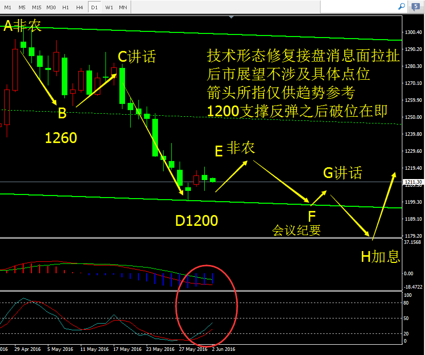 老謝煉金:5月非農(nóng)你想象不到的展望我都想到了(圖解) 影響黃金的波動因素當下無非是美元數(shù)據(jù),在整個五月基本上被美元數(shù)據(jù)主導: A,從4月非農(nóng)數(shù)據(jù)公布之前到5月3號公布之日,金價都是如市場預期般走高。不過在如此疲軟的數(shù)據(jù)之下美聯(lián)儲官員依然持有鷹派言論,金價應聲回落 B,技術形態(tài)1260形成支撐平臺,在1260-1300箱體區(qū)間運行如此之久終于被測試了支撐力度 C,好景不長,反彈20個點左右便迎來會議紀要和連續(xù)的美聯(lián)儲官員講話,在連續(xù)的樂觀預期轟炸之下使得美元大漲,打壓非美商品,金價快速破位1260支撐關口。在耶倫也給出鷹派言論之后,金價便觸及了1200低位。 D,與1300、1260一樣,1200也屬于心理支撐關口,去年在這兩個點位糾纏了非常久的時間,因此這里的支撐是顯而易見的。并且在非農(nóng)預期之下,看金價的反彈也無可厚非了,因此又迎來了20個點左右的反彈空間。 E,由于上次非農(nóng)的前車之鑒,那么本次非農(nóng)就算再不濟,美聯(lián)儲也會表現(xiàn)的很有加息信心,因此就算利好金價,也不會有太多的漲幅了,相反,要知道在中旬又會迎來6月會議紀要,在6月加息預期之下甚至在數(shù)據(jù)公布之后會出現(xiàn)利好走跌的行情。而如果非農(nóng)數(shù)據(jù)直接給出利空,那自然就不用過多解釋。因此非農(nóng)-會議紀要這個時間周期看跌。 F,那么重點來了,6月加息的概率到底有多高?筆者個人認為,就算美聯(lián)儲已經(jīng)打算在6月加息也會做出改變,原因就是6月23號的英國公投。加息決策盡量避免市場風險事件的沖擊是可取的,如果6月加息真的很有必要,推遲一個月也沒什么太大的問題,如果不是如此著急也可以延后至9月份。因此,會議紀要之后的不加息決定將會再次提振金價反彈,6月17-18號之后看反彈行情。 G,反彈行情預計不會持續(xù)太久,因為等市場冷靜下來之后就會明白,加息并沒有遠去,美聯(lián)儲官員也會繼續(xù)發(fā)表樂觀預期的言論,從而再次將金價拉回谷底,因此在會議紀要反彈行情走出之后將繼續(xù)看跌金價。 H,是不是今年就是一個跌勢了呢?其實不然,老謝煉金認為從年線上來看,金價今年收陽可能性更偏大一些,而真正抄底的時候就是在加息決定出來之后。這一觀點老謝煉金早在去年加息之前就已經(jīng)分析過,果不其然在去年12月份加息之后,金價一路高歌猛進,今年在加息之后極大可能性復制該趨勢,無論是7月還是9月,加息決策出來之后,并不是一路跳水,相反,只要加息消息走出低點建議可以低位布局中線多單 備注:后市展望的箭頭僅代表方向不代表具體點位,分析文章僅供參考,不作投資建議,具體行情也要根據(jù)即時數(shù)據(jù)和消息進行調(diào)整,更多投資分析和技巧可咨詢老謝煉金本人。 |