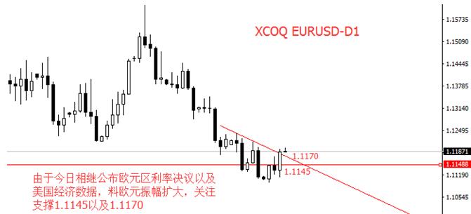 今日關注: 19:45 歐洲央行利率決議 20:15 美國ADP就業數據 20:30 歐洲央行行長德拉吉召開新聞發布會 基本面: 時至6月,市場走勢動蕩,除了美聯儲加息預期的炒作,英國退歐公投也在月底舉行,周三公布的消息以及數據使得市場尋求避險,英國退歐預期升溫,日本推遲上調消費稅,中國經濟疲軟等暫時冷卻了市場對美國加息預期的熱情,上一交易日歐元、日元走強。 近期市場走勢也將繼續圍繞這幾個熱點而運行,其中近期公布的美國經濟數據會左右市場對美國加息預期。北京時間晚間將公布美國ADP就業數據,并且預期利好美元,同時歐洲央行在利率決議公布后將迎來歐洲央行行長德拉吉講話,在面對美國加息為確定以及目前全球經濟出現種種問題之際,料歐洲央行不會輕舉妄動,在貨幣政策上繼續維持寬松規模,并且維持利率不變,因此非美貨幣走勢上需要以美元作為風向指標。 技術面: 美元指數始終圍繞96關口阻力運動,周初在觸及該阻力后下行,目前徘徊在95.5一帶,圍繞加息,美指要突破96需有消息支撐,而非農如出現較華麗數據或能達成,因數據有加強美國加息預期的作用。 歐元技術方面,在昨日走勢中打破三角震蕩,目前呈階段性反彈,其中需要注意的是今日公布的數據及消息會左右歐元走勢,料區間擴大,日線圖顯示歐元多頭較強,交易上可以選擇低位做多。今日建議在1.1145做多,止損30點,止盈1.1220。 黃金低位三角震蕩,主要因市場動蕩未有明確指引,在周初1200構筑階段性底部后,現需要更多消息支撐,今日歐洲央行止盈按兵不動,那么都是利好黃金的表現。交易上繼續低位做多,建議在1207做多,止損4美金,止盈1225。 |