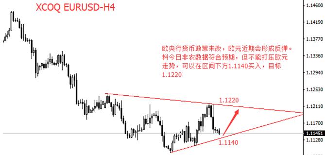 今日關注: 20:30 美國非農就業數據 22:00 美國工業訂單數據 22:00 美國耐用品訂單數據 基本面: 北京時間周四晚間,歐洲央行維持利率不變,隨后的新聞發布會上歐洲央行行長德拉吉表示QE至少延續到2017年3月,通脹會到達預期合適水平,同時也在2015年寬松至今首次上調通脹預期。德拉基表示,歐元區經濟風險偏向下行,而下行風險與全球經濟和英國脫歐公投有關:出口低迷影響經濟增長,歐洲央行認為,英國最終會留歐,但已經為可能的英國脫歐公投結果做好了準備。歐洲央行動態符合預期,未對現有的貨幣政策進行變動,匯率呈區間震蕩,為形成趨勢。 昨日公布美國ADP數據有所好轉,但稍不及預期,美元對此反應不大,今日晚間將公布美國5月非農數據,預期利好,并且ADP數據的支撐,市場對美國非農數據頗有信心,料白天美元指數需小幅度反彈,等待非農數據指引方向。 技術面: 由于歐洲央行按兵不動,黃金理應上行,但在美國數據的壓制下,黃金價格走勢繼續在低位維持震蕩,區間為1208-1220。震蕩大致呈上升上角,交易以低位買入為主。日內可以在1208做多,目標1220,止損1204,料今日非農數據符合預期,但不會大幅打壓黃金價格。 如預期般,歐洲央行未對現有貨幣政策進行改動,在等待美國6月是否加息指引,今日雖然重頭戲在美國非農,但料數據符合預期,不會對歐元進行打壓。技術上歐元會在低位形成反彈,今日在1.1140做多,目標1.1220,止損25點。英鎊方面,持續震蕩,區間為4380-4450。 |