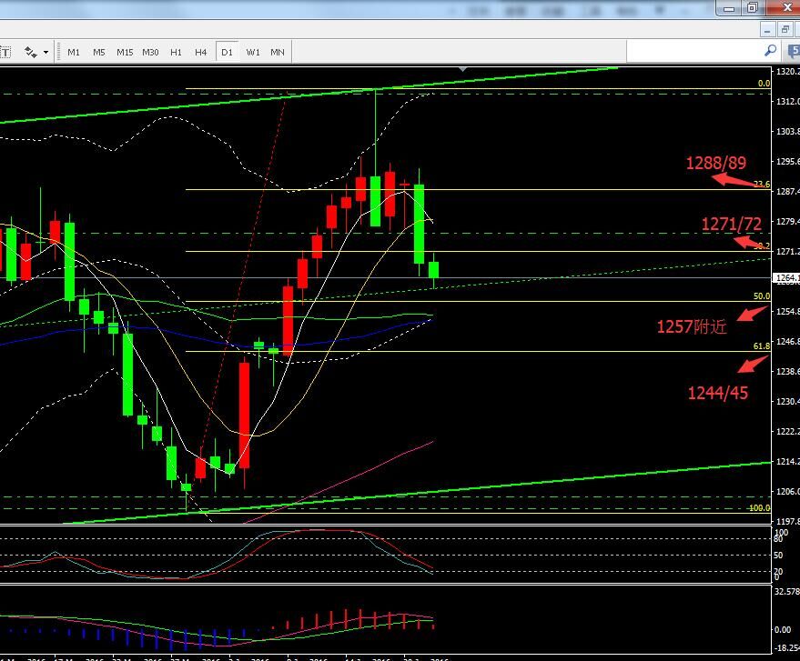 1260-62一線操作多單,止損設置在1257,為什么設置這個地方,我們現在可以根據最近的走勢畫一條回調線(下圖),以1315為近期的高點,以1200為本次上漲的起步點。而50對應的點位就是1257附近,如果本單被止損,那么建議多頭上,我們不必要再次操作了,因為趨勢轉變,空頭的力度下行還將持續。 在根據最近的走勢來看,由于公投的原因,留歐的概率加大,導致避險減弱,黃金到目前整體跌幅已經超過50個點,這樣的走勢,在消息還沒有完全落地之前,已經完全超乎意料。如果行情還出現繼續下行,打破強支撐位,那么對于消息公布后,行情續跌就沒有多大動能了。 而且我們可以看到特別是最近兩天的這波跌勢,黃金從1293開始下滑,低點逐漸降低,目前已經接近了1260.而當中出現的回調確是微乎其微,我們都知道行情出現大跌無回調,這樣的走勢是很難長久的。 所以我認為,今天的反彈有望再次站上1270上方,明天繼續處于上方調整,后天消息公布后,才是重點,行情才有更多下滑的余地,對于多單上首次關注的地方是1270/71其次是1276. 文章內容僅供參考,不構成投資建議。投資者據此操作,風險自擔。 |