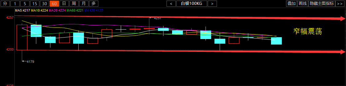 四小時圖 目前不管從小時圖還是4小圖,白銀都是處于一個窄幅震蕩的行情,各均線指標黏合在一起,MACD綠色能量柱齊平,相對強弱指標也走平,目前行情是處于一個弱勢震蕩的行情;