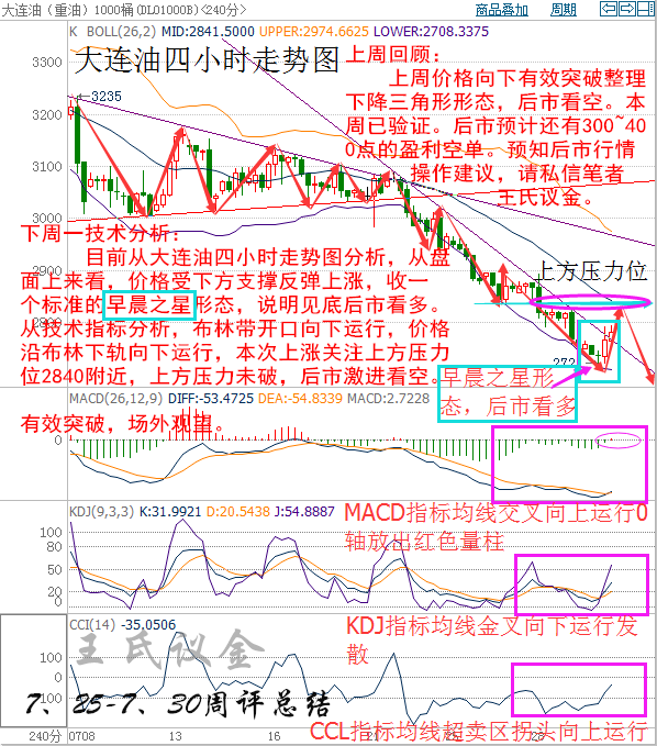 目前從大連油四小時走勢圖分析,從盤面上來看,價格受下方支撐反彈上漲,收一個標準的早晨之星形態,說明見底后市看多。從技術指標分析,布林帶開口向下運行,價格沿布林下軌向下運行,本次上漲關注上方壓力位2840附近,上方壓力未破,后市激進看空。有效突破,場外觀望。MACD指標均線交叉向上運行并放出紅色量柱,KDJ指標均線金叉向下運行發散,CCL指標均線超賣區拐頭向上運行。綜合各指標及盤面分析來看,價格短期上漲,激進者可嘗試短線做多,建議空單以逢高做空為主。