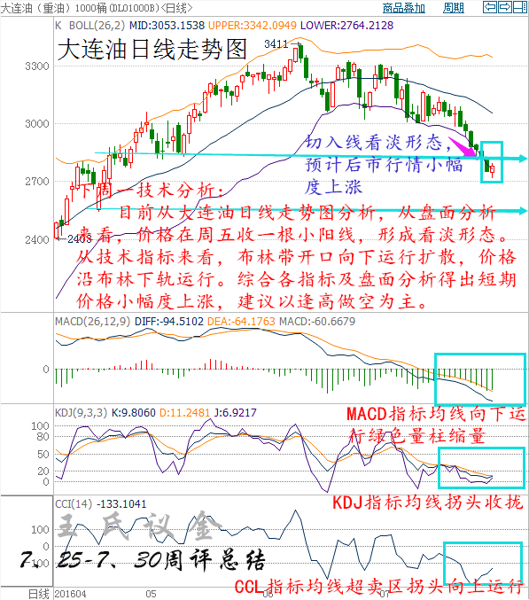 目前從大連油日線走勢圖分析,從盤面分析來看,價格在周五收一根小陽線,形成看淡形態。從技術指標來看,布林帶開口向下運行擴散,價格沿布林下軌運行。MACD指標均線向下運行綠色量柱縮量,KDJ指標均線拐頭收攏,CCL指標均線超賣區拐頭向上運行。綜合各指標及盤面分析得出,短期價格小幅度上漲,建議以逢高做空為主。