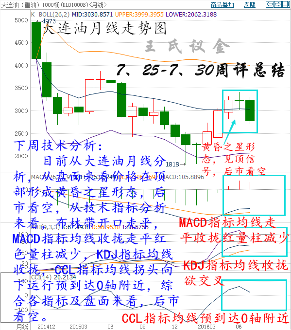 目前從大連油月線分析,從盤面來看價格在頂部形成黃昏之星形態,后市看空,從技術分析來看,布林帶開口走平,MACD指標均線收攏走平紅色量柱減少,KDJ指標均線收攏,CCL指標均線拐頭向下運行預到達0軸附近,綜合各指標及盤面來看,后市看空。