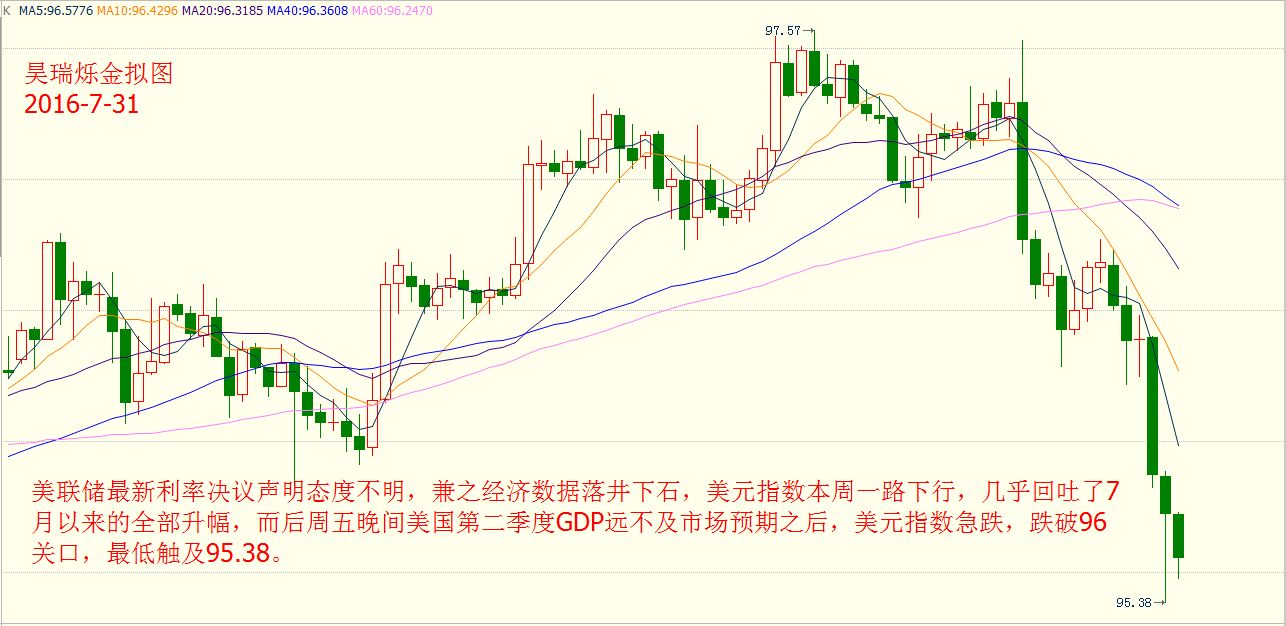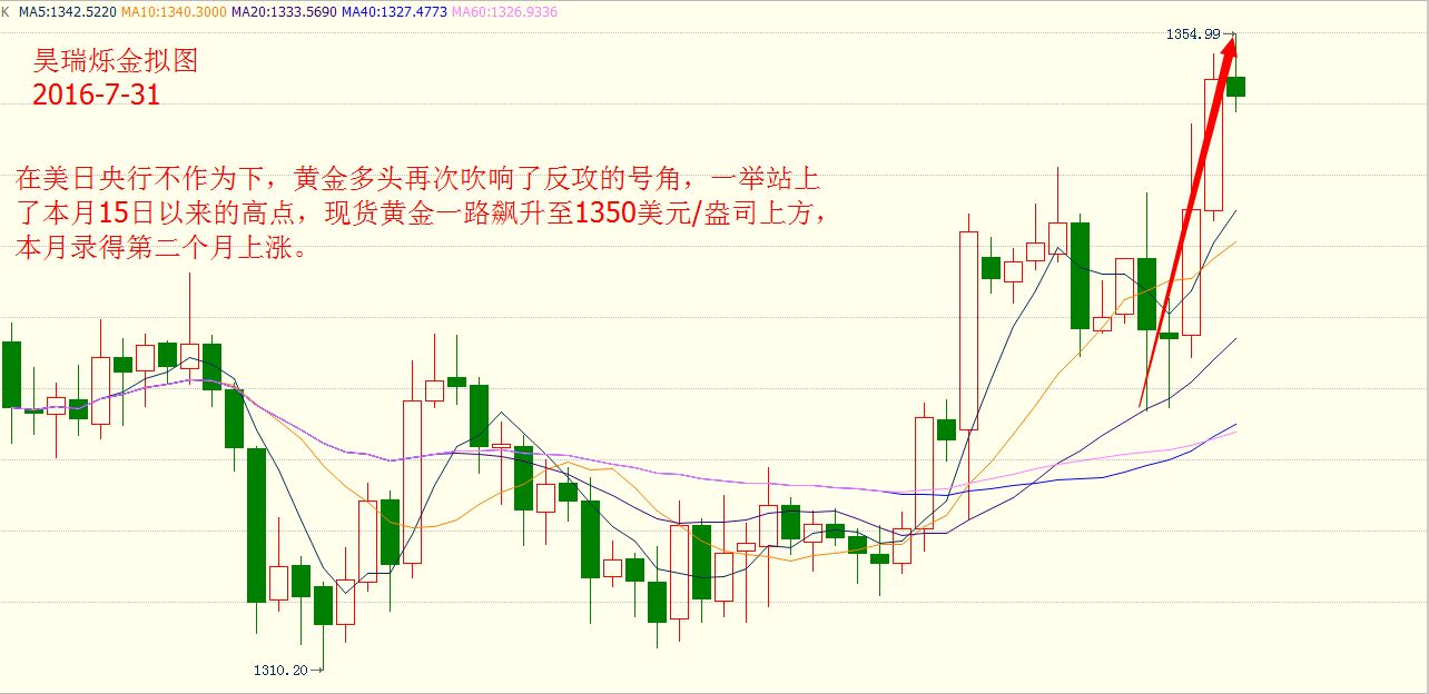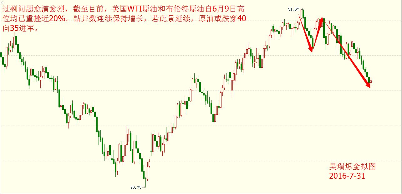 昊瑞爍金:油價7月現“熊起”,金銀反攻無絕期?(周評) 文/昊瑞爍金 本周,美聯儲攜手日本央行加入全球央行“維穩大軍”隊列,美聯儲自加息后已連續第五次選擇按兵不動,并在此次利率決議中表達出一絲鷹派氣息;日本央行黑田隨后也選擇維持基準利率和QQE規模不變,僅擴大美元借貸計劃一倍到240億美元,計劃執行事件為4年。這一消息公布,無奈這三年來,日元投資者又慘遭黑田東彥套路... 之前沙特、高盛等業界巨頭都宣稱原油供應過剩局面完結,助漲了交易員們的看多情緒,如今,這一情緒正在迅速衰退。這使得油價在7月便重挫近15%,單月跌幅創下一年來最大。而最新公布的美國鉆井平臺數據更是加劇了市場對油價的擔憂。 另外市場最為關注的美國GDP數據遠不及預期,令美聯儲未來加息路徑蒙上一層陰影,美元指數本周一路下行幾乎回吐了7月以來的全部升幅;現貨黃金趁勢一路飆升至1350美元/盎司上方,本月錄得第二個月上漲。原油方面,經濟成長放緩和原油和成品油庫存居高不下拖累油價持續走軟,本月美國原油期貨表現為一年最差。 美國油服公司貝克休斯(BakerHughes)周六(7月30日)公布數據顯示,截至2016年7月29日當周美國石油活躍鉆井數增加3座至374座,為連續第五周增長。 數據并顯示,截至7月29日當周美國石油和天然氣活躍鉆井總數增加1座至463座,較去年同期減少411座;美國當周天然氣活躍鉆井數減少2座至86座。 美聯儲對于加息態度曖昧不明,美國第二季度GDP落井下石 本周三(7月28日)美聯儲最新的利率決議,市場普遍預計美聯儲將維持利率不變,但是政策聲明中可能出現對美國經濟持更樂觀態度的描述,這可能強化市場關于美聯儲在今年稍晚時候加息的預期。 但結果令人萬眾期待的美聯儲利率決議又一次打了太極,美聯儲宣布維持聯邦基金基準利率0.25%-0.5%不變。 美聯儲最新利率決議聲明態度不明,兼之經濟數據落井下石,美元指數本周一路下行,幾乎回吐了7月以來的全部升幅,加之周五晚間美國第二季度GDP遠不及市場預期之后,美元指數急跌,跌破96關口,最低觸及95.38。 “瘋子”黑田意外維穩,寬松政策或為黑田套路 對于本次日本央行利率決議,市場普遍預期日本央行會出臺新的刺激措施,包括對于日本央行直升機撒錢,或擴大購債規模的揣測聲音鼎沸,投資者焦急等待的利率決議卻姍姍來遲,多空爭奪在利率決議前就已顯現出來,美元兌日元走出上下近200點的巨大波動。 最終,日本央行最新利率決議塵埃落地,日本央行宣布維持利率-0.1%不變;維持量化寬松(QQE)規模在80萬億日元;僅擴大ETF購買規模到6萬億日元,將美元貸款計劃規模擴大一倍,至240億美元。 由于寬松力度遠不及預期,美元兌日元短暫沖高后大跌,短線震幅近300點,最終險守102關口。 (美元兌日元1小時圖) 受美元指數走軟助陣,黃金錄得第二個月上漲 在本周美聯儲的政策會議上,美聯儲沒有暗示今年晚些時候是否進一步升息,而包括美國第二季國內生產總值年率,耐用品訂單和成屋簽約銷售數據都遠不及預期,美元指數承壓走軟; 此外日本央行維穩利率,溫和增加購買上市交易基金(ETF),讓原本希望會推出更激進舉措的投資者頗感失望,也側面助推美元下跌,帶動黃金走高。 Comex最活躍12月期金在日本央行公布利率決議一刻成交4616手,現貨黃金價格出現近15美元的劇烈震蕩,也顯現日本央行在黃金市場的威力 在美日央行不作為下,黃金多頭再次吹響了反攻的號角,一舉站上了本月15日以來的高點,現貨黃金一路飆升至1350美元/盎司上方,本月錄得第二個月上漲。 (現貨黃金4小時圖) 原油庫存過剩持續發酵,美原油本周重挫5% 美國原油價格在本周下跌了約5%,周五原油價格一度跌至40美元,但隨后因一部分投資者對空頭押注鎖定獲利,令油價小幅反彈;但并未逆轉自本月以來原油價格已經下跌了約13%的事實,原油市場或重入技術熊市。 全球經濟成長放緩和原油和成品油庫存過剩拖累油價持續走軟,在油價低迷的情況下,各大石油公司依舊不畏懼低油價拖累,仍在加大生產。 在亞洲煉廠原本就準備進入維護期之際,疲弱的利潤率促使煉廠削減產能利用率,亞洲煉廠已開始降溫,石油船貨很難出售,第三季需求可能進一步下滑。這將導致石油需求和價格承壓。汽油需求停滯,加拿大和尼日利亞產出改善,均對油價不利。 另外,利比亞和尼日利亞原油供應逐步恢復,美國原油鉆井平臺在不斷增加中,美國頁巖油生產商也在逐漸恢復產出活動,多種利空原因交織也令油價后市走勢不容樂觀。 過剩問題愈演愈烈,截至目前,美國WTI原油和布倫特原油自6月9日高位均已重挫近20%。鉆井數連續保持增長,若此景延續,原油或跌穿40向35進軍。 (美國原油9月期貨日線圖) 下周市場展望: 英國央行將分別于下周二及周四公布議息結果,成為市場焦點。英國在6月23日公投脫歐出現“黑天鵝”,英倫銀行更意外地在7月會議靜觀其變,按兵不動,市場普遍預期英倫銀行會在這次議息會中出手降息。 此外,日本央行將于下周四公布6月會議記錄,也受到市場關注。另一方面,下周金融市場將迎來多項重要經濟數據,重頭戲是周五美國公布的7月非農業職位及失業率。 美原油: 日線來看,布林帶三軌向下運行,K線價格沿下軌震蕩下行,受下軌強力支撐,MACD指標在零軸下方死叉向下向下運行,綠色動能柱不斷放量綜合來看,K線價格受布林帶中軌和前期高點強力