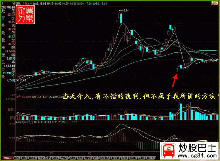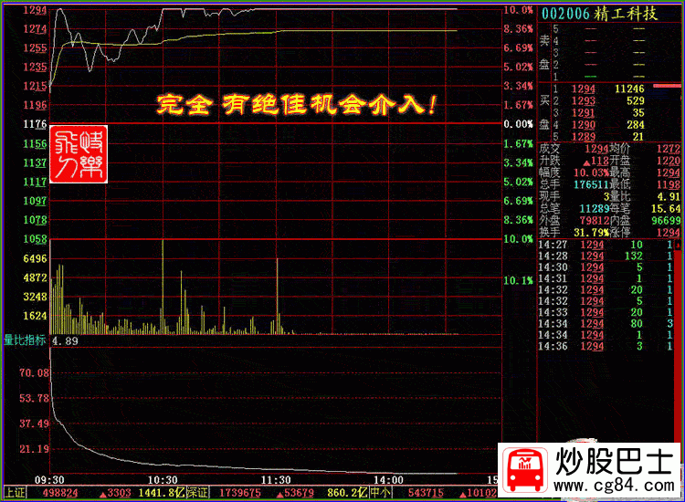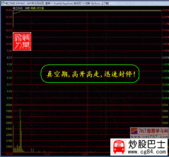 二.巨量之破頂沖關 K線形態:在某種利好的刺激下,股價連續數日上漲,在前頭部放出巨量,最終以漲停板報收,說明主力統吃上方籌碼 ,上攻心態急切!當前幾日,本人沒有對該股引起足夠關注,當發現時,已經快漲停了,當時估計如能封停,第二日可能會呈現高開高走縮量封停的走勢,后來的走勢正如我所估計的,但可惜的是,在封停后,本人一看沒有成交就很快撤單了,盤中沒有再看過!盤后分析時發現完全有時機介入! 股票實例: 002006精工科技 時間 :2007年8月22日 在加息的下刺激下,該股 不但沒有低開,反而當天以11.98元高開,開盤70倍以上的量比 ,很快封停隨后打開 ,盤中曾一度跌到漲停的5%.正是時機!在盤中不斷地入巨量成交,10:30準時封停,之后,漲停板反復打開,給人恐慌,不斷地有人出逃,上午收盤前封停,收盤后從成交量上看,換手極度萎縮!說明該跑的都跑了!盤中曾一度跌到漲停的5%.正是時機!在盤中不斷地入巨量成交,10:30準時封停,之后,漲停板反復打開,給人恐慌,不斷地有人出逃,上午收盤前封停,收盤后從成交量上看,換手極度萎縮!說明該跑的都跑了!當天的換手率31.88%! K線分析:2007年8月20日,該股在消息真空時,高開高走,迅速封停,當日的換手7.57%,最佳換手漲停! 8月21日出消息:002006 精工科技生命歷程: 2007年8月21日 精工科技:太陽能多晶硅結晶爐單臺研制成功到形成批量生產還需要較長時間 精工科技(002006)2007年8月20日,《證券時報》刊登了《精工科技造出太陽能多晶硅結晶爐,成為國內唯一能生產太陽能核心設備的廠家》,現公司對上述事項說明如下: 1、公司控股子公司紹興縣精工機電研究所有限公司目前已經研制成功了太陽能多晶硅結晶爐1臺,并于2007年6月開始推向市場,上述事項公司已在《2007年半年度報告》中作了披露。 目前,紹興縣精工機電研究所有限公司正在對研制的太陽能多晶硅結晶爐核心技術申請國家專利。 2、太陽能多晶硅結晶爐的研制成功,將可能成為公司新的經濟增長點。但是,該產品的單臺研制成功到形成批量生產,尚需很多工作要做,還需要較長的時間,因此,形成具體的產能和產量還存在較大的不確定性,請投資者注意投資風險。 同樣,高開高走再度封停,這種目的就是不讓跟風盤介入!