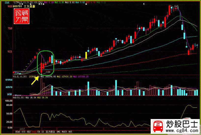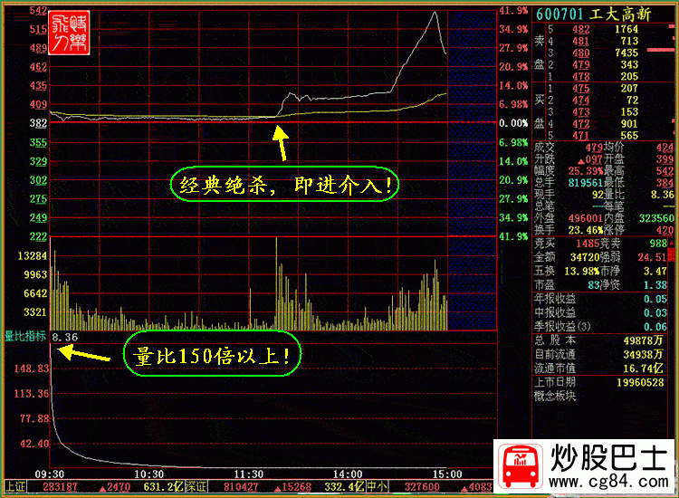 三.重組股或股改股的巨量買入 量比要求:量比要大,幾十倍或更大,絕對價位和當日漲幅不是很大!符合經典短線必殺的一定要及時介入!量比越大,說明主力吸籌或拉升的愿望的越強烈,不管是主力出貨還是吸籌,短線必有豐厚的獲利空間. 適用股票:股改股,重組股!這兩類股票上市當日沒有漲幅限制,可以有機會讓我們有豐厚的獲利空間! 股票案例:600701 工大高新 時間:2007年2月13日 股改上市 10送10 說明:當天以3.99元低開,最低3.84元(高天除權價3.82元),量比150倍以上,下午1:30前一直在分時均價線下方窄幅運行,后向上突破分時均價線,如果懂得這個原理,在均價線下方都是買入時機!上午一直沒有跌破除權價,當天盤面最高漲40%以上,收盤漲25.39%,如能在突破分時均價線時介入,當天可獲利15%以上,第二天完全可以在沖高時賣出,如能持股6天,可獲利30%以上,這個股能上漲的 理由是絕對價位低,量比巨大!