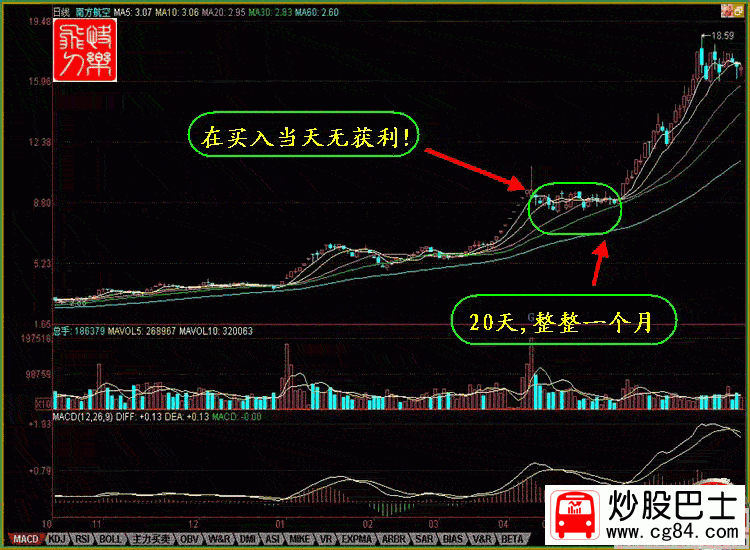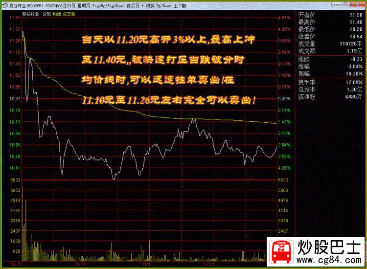 四.開盤時的巨量買入法 量比要求:量比要大,最好幾十倍,(有時得根據情況而定)K線形態:有前一日的上漲或近幾日有所上漲最好,當日首次放巨量,或承接前一日放量,高開高走,可追漲買入! 股票案例:600265 景谷林業 時間:2007年8月22日 大盤環境:牛市中的加息日 股票 說明:前一天,股票以漲停收盤,在加息的環境下,高開1.43%,開盤時的量比55倍,高開高走,隨后回落,在形成了較標準的頭肩底后,再度封停,盤中有多次打開,說明上方拋壓較重,第二日可擇機賣出,當天終以漲停收盤,換手率25.99%,23日開盤11.20元,高開3%以上,高開幅度較大,快速上沖至11.40元快速被打壓下來,在跌破分時均價線時可以快速較低掛單賣出! 600265量比巨大買入法