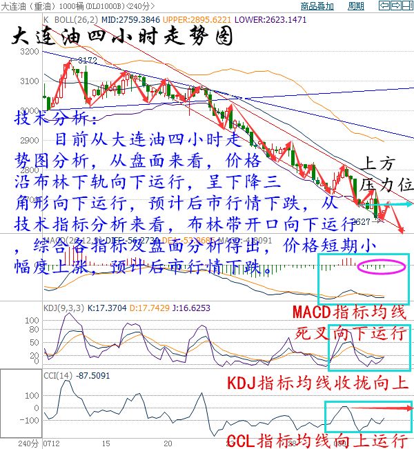 原油的整體走勢(shì)已經(jīng)不用再去過分強(qiáng)調(diào),昨日成功跌破40美元后,后期空頭一馬平川;日線隔日油價(jià)錄得實(shí)體大陽,不僅回吐上周五全部漲幅并成功刷新新低,日線油價(jià)依然維持在MA5均線及下軌線中間運(yùn)行,短期日線毫無反彈跡象,空頭主宰者市場(chǎng),日線我們可以著重關(guān)注MA5均線對(duì)油價(jià)的控制;四小時(shí)油價(jià)二次死叉運(yùn)行,爬的有多高跌的就有多深,隔日油價(jià)完美的詮釋的這句話,目前油價(jià)已經(jīng)觸及下軌線,短期將會(huì)小幅反彈或震蕩調(diào)整空間,操作上建議高空。 大連油行情分析: 目前從大連油四小時(shí)走勢(shì)圖分析,從盤面來看,價(jià)格沿布林下軌向下運(yùn)行,呈下降三角形向下運(yùn)行,預(yù)計(jì)后市行情下跌,從技術(shù)指標(biāo)分析來看,布林帶開口向下運(yùn)行,MACD指標(biāo)均線死叉向下運(yùn)行綠色量柱縮量,KDJ指標(biāo)均線收攏向上,CCL指標(biāo)均線向上運(yùn)行,綜合各指標(biāo)及盤面分析得出,價(jià)格短期小幅度上漲,預(yù)計(jì)后市行情下跌。 8.3大連油今日操作建議 【大連重油操作建議】 1、2700-2720做空,止損30個(gè)點(diǎn),目標(biāo)2660-2680; 2、2630-2650做多,止損30個(gè)點(diǎn),目標(biāo)2690-2710; 今日可關(guān)注的消息: ①09:45 中國(guó)7月財(cái)新服務(wù)業(yè)PMI及7月財(cái)新綜合PMI 、15:55 德國(guó)7月服務(wù)業(yè)PMI終值 、16:00 歐元區(qū)7月服務(wù)業(yè)PMI終值 ④16:30 英國(guó)7月服務(wù)業(yè)PMI ⑤17:00 歐元區(qū)6月零售銷售月率 、20:15 美國(guó)7月ADP就業(yè)人數(shù)【重點(diǎn)關(guān)注】 、21:45 美國(guó)7月Markit服務(wù)業(yè)PMI終值 ⑧22:00 美國(guó)7月ISM非制造業(yè)PMI 、22:30 美國(guó)至7月29日當(dāng)周EIA原油庫(kù)存【重點(diǎn)關(guān)注】 集體智慧,傾力打造。我們自成一派,贏在“多空”,更多原油投資資訊歡迎添加關(guān)注本人專欄 (以上文章由春雨原創(chuàng),轉(zhuǎn)載請(qǐng)注明出處。溫馨提示,投資有風(fēng)險(xiǎn),入市需謹(jǐn)慎。以上僅代表春雨個(gè)人觀點(diǎn),不作操作依據(jù),據(jù)此操作風(fēng)險(xiǎn)自擔(dān))