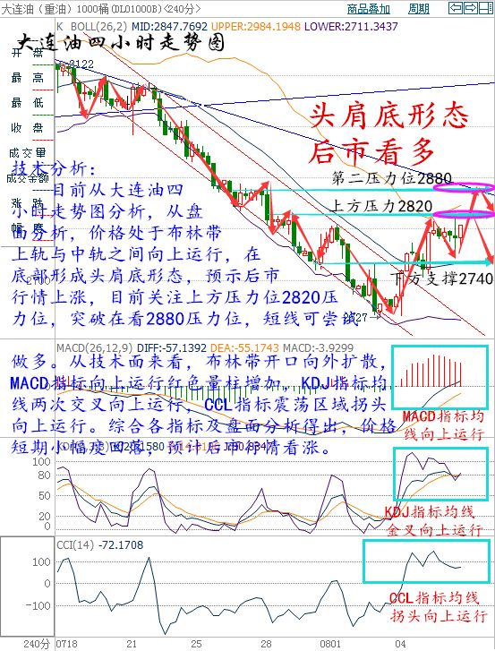 【基本面】 周五(8月5日)市場密切關注的美國非農就業數據以靚麗的表現落幕。在日本央行、歐洲央行、英國央行以及澳洲聯儲等世界主要央行寬松預期愈演愈烈之際,唯獨美聯儲還在探討升息。本次強勁的非農數據一改近來GDP等疲軟數據的陰霾,使得聯儲年內加息的預期大幅升溫。原油空頭回補的因素繼續支撐油價,但美元的大幅走強也限制了油價的漲幅,油價維持震蕩交投,基本收平。 雖然失業率因為就業人數增多而持平,但非農大幅好于預期加上平均時薪增長,美聯儲年內加息的預期將受到大幅提振,耶倫就曾經表示美國只需新增不到10萬工作崗位就能與人口增長同步,但隨著就業市場疲軟減少,今年下半段的非農或將在15-16萬人之間波動。 美國油服公司貝克休斯(BakerHughes)周五(8月5日)公布數據顯示,截至2016年8月5日當周美國石油活躍鉆井數增加7座至381座,為連續第六周增長,盡管石油鉆井數大幅增加7座,但油市并沒有較大反應。美國7月非農就業崗位大幅增加,一度推動美元大漲,之后縮減漲幅。美元上漲通常使原油和其他以美元計價的商品對持有歐元和其他貨幣的投資者來說更昂貴,從而降低這些商品需求。 【美原油技術分析】 行情回顧:上周原油市場大起大落,幾度跌破40美元大關,并刷新近四個月低位。但周三公布的EIA原油庫存數據油價上演“V型”反彈開啟周內反彈之路;另外,萬眾矚目的美國7月非農報告也如期而至,意外大好的非農數據并沒有給原油市場較大壓力,油價反而刷新6個交易日內最高記錄。與此同時,鉆井數大增將施壓本周油價走勢。 從日線圖上來看,中線來看油價仍處于下行趨勢,但短線上行動能較足,上方承壓于22日均線位置。MACD指標快慢線在零軸下方形成金叉,綠色動能柱縮量;KD指標形成金叉向上運行。春雨聚金綜合來看,春雨預計油價短期將反彈至44-46美元附近,但中線仍將看空,建議投資者關注上方42.5美元壓制,下方支撐看向41.5美元一線。短線看多,操作策略:回落做多。 【大連油油技術分析】 目前從大連油四小時走勢圖分析,從盤面分析,價格處于布林帶上軌與中軌之間向上運行,在底部形成頭肩底形態,預示后市行情上漲,目前關注上方壓力位2820壓力位,突破在看2880壓力位,短線可嘗試做多。從技術面來看,布林帶開口向外擴散,MACD指標向上運行紅色量柱增加,KDJ指標均線兩次交叉向上運行,CCL指標震蕩區域拐頭向上運行。綜合各指標及盤面分析得出,價格短期小幅度回落,預計后市行情看漲。 【大連重油操作建議】 1、2840-2860做空,止損30個點,目標2780-2800; 2、2760-2780做多,止損30個點,目標2810-2830; (以上文章由春雨原創,轉載請注明出處。溫馨提示,投資有風險,入市需謹慎。以上僅代表春雨個人觀點,不作操作依據,據此操作風險自擔) |