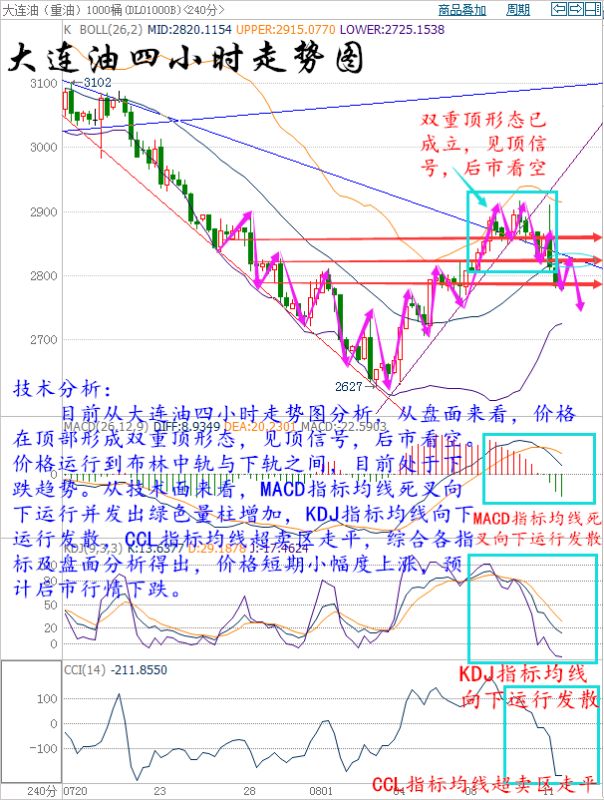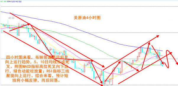 昨日歐盤沖高,美盤2次沖高刷新高點,后半夜原油價格回吐前面的漲幅最終在日線圖中錄得一根帶長上影線的陰柱,日線來看,K線運行于布林帶中軌附近,MA5和MA10交金叉運行,附圖指標MACD交金叉運行于零軸下方,紅色動能放量。四小時圖來看,布林帶通道目前呈向上運行趨勢,5、10日均線形成死叉。附圖MACD指標高位死叉向下運行,綠色動能柱放量;RSI指標三線聚攏向上運行。綜合來看,預計短線將小幅反彈,而后回落。 大連油技術分析: