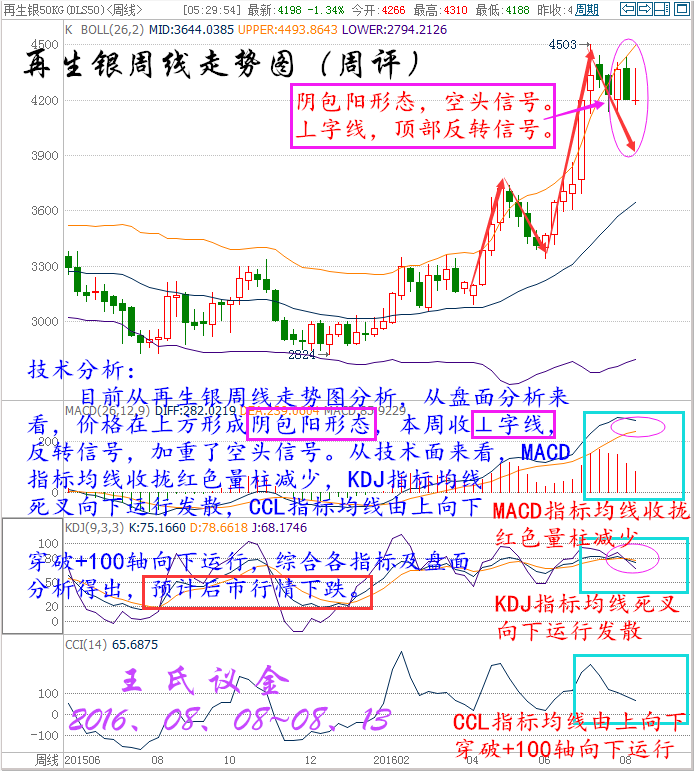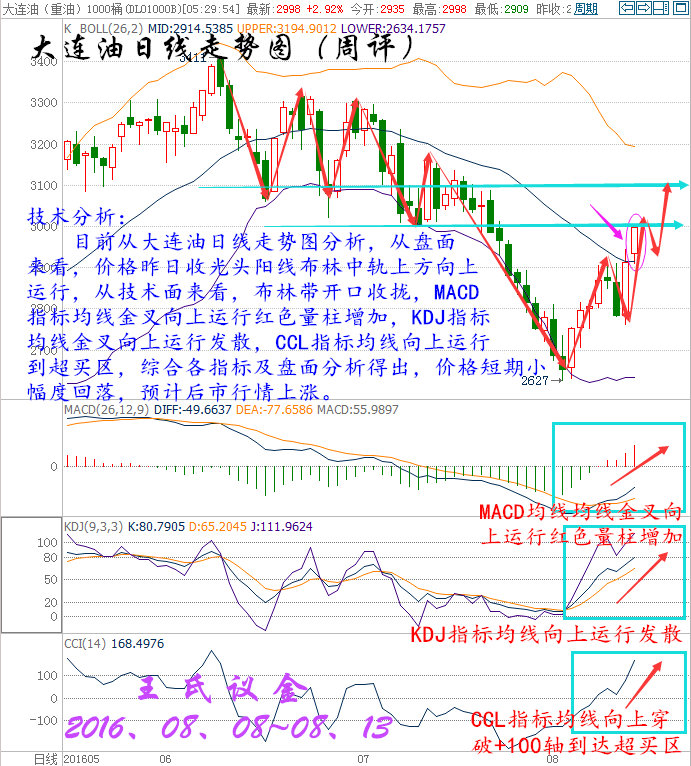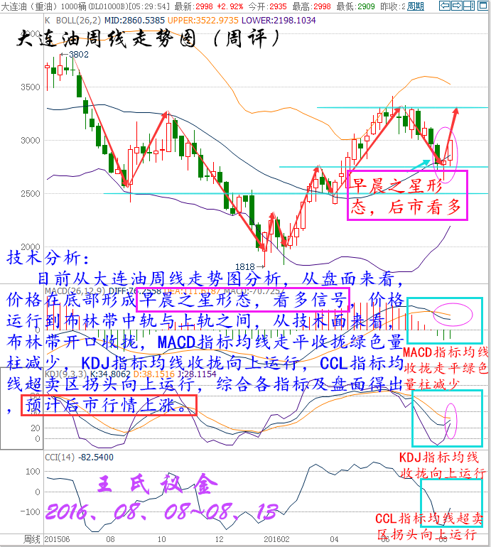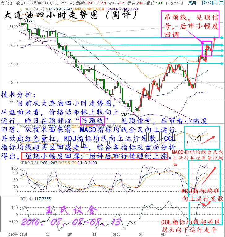 時間過的好快,一周就要說聲拜拜,八月轉眼進入下旬,一年已經揮霍過半,一生踏入而立之年。好多事還未準備,好多夢還未開始,公平于時間,也區別于時間。情商決定了成就事業的大小,執行決定了靠近夢想的距離。投資是人性的顯示器,投資也是人生的縮影,你就是主角,更是導演,所有的喜劇或悲劇都是親自勾畫的結果。 過去,經常聽到一句話:別講那么多,直接告訴哥咋干,多或空?。意思就是說別扯沒用的,不管什么貓逮著老鼠才是好貓,浮躁的社會已經變的如此不安,人人都想張口要一個心里想,卻從不為這背后的原由來聆聽,這就導致了同樣的行情經常出現,卻被不同的人反復實驗,早盤的急漲、趨勢破位的回踩、急跌反抽后的上升,這是隔三差五就碰到,但人們已經沒了聽完的耐心…… 美國WTI原油9月期貨周五(8月12日)收漲1.00美元,或2.30%,報44.49美元/桶,本周大漲6.22%。布倫特原油10月期貨周五收漲0.93美元,或2.02%,報46.97美元/桶,本周急升6.1%。凍產傳聞再度浮現的影響仍在持續發酵,日內美元走弱也為油價提供了有效支撐,不過由于美國石油活躍鉆井數大幅增加,油價漲勢能否持續成為疑問。美國WTI原油期貨價格盤中最高觸及44.60美元/桶,布倫特原油期貨價格盤中最高觸及47.05美元/桶。 本周行情回顧: 周一(8月8日)原油盤初,油價小幅上漲。美油交投于41.98美元/桶附近,漲幅約為0.43%;布油交投于44.40美元/桶附近,漲幅約為0.29%。油價跌穿40美元后獲利的投資者進一步結清空頭頭寸,扶助油價反彈。但是,美國石油活躍鉆井數增加7座至381座,錄得連續第六周增長,油市供應過剩的壓力尚存,仍令油價承壓,市場交投仍需謹慎。強勁的美國就業數據帶動美元上漲,令油價稍早承壓。尾盤的回補空頭,使油價扳回部份稍早錄得的跌幅,收盤小幅上漲。 周二(8月9日)原油盤初,油價小幅下跌。美油交投于42.80美元/桶附近,跌幅約為0.51%;布油交投于45.17美元/桶附近,跌幅約為0.48%。市場分析認為,有關石油輸出國組織(OPEC)可能重啟凍產計劃的傳聞對油價的提振作用十分有限。供應過剩壓力猶存,加之美元走強,限制油價上行空間,市場交投仍需謹慎。因有關石油輸出國組織(OPEC)可能重啟凍產計劃的臆測重燃,緩解了市場對原油供應過剩的擔憂情緒,從而提振油價。 周三(8月10日)亞歐時段油價油價震蕩走弱,美原油一度跌逾1%創兩日低點至42.27美元/桶,布倫特原油10月期貨最低觸及44.50美元/桶,EIA短期能源報告上調美國產量預期,凌晨API原油庫存意外增加,都給空頭反撲提供了機會,市場繼續關注晚上出爐的美國EIA原油庫存數據。凌晨EIA發布短期能源報告稱,將美國2016年原油產量預期從861萬桶/日上調至873萬桶/日。將美國2016年原油需求增速預期維持在16萬桶/日不變。 周四(8月11日)亞歐時段國際油價小幅走弱,美原油9月期貨目前交投于41.46美元/桶,布倫特原油10月期貨目前交投于43.77美元/桶,隔夜美國EIA庫存意外大增,且沙特原油產量創紀錄新高,令油價再次遭遇重擊,目前市場人氣較為低落,油價料將重回跌勢。因美國原油庫存增加,且沙特產量創下紀錄,強化了對于持續的供給過剩將持續到明年的擔憂。美國能源信息署(EIA)數據顯示,上周美國原油庫存增加105.5萬桶,至5.236億桶,市場預估為減少102.5萬桶。數據公布后油價大跌逾3%。 周五 (8月12日)原油盤初,油價延續漲勢,小幅震蕩拉升。美油交投于43.61美元/桶附近,漲幅約為0.28%;布油交投于46.10美元/桶附近,漲幅約為0.13%。周四發布的IEA月報緩解市場看空情緒,且沙特油長講話令凍產計劃再次浮出水面,在很大程度上提振市場的樂觀情緒。但是,分析師認為供應過剩的問題尚存,利好影響或有限,市場交投仍需謹慎。國際能源署(IEA)表示,2016下半年原油供應過剩的狀況將不復存在,這在很大程度上緩解了近期以來彌漫原油市場的過剩擔憂情緒。此外,沙特油長稱可能采取行動穩定油價,這也在一定程度上提振市場樂觀情緒。國際油價周四飆升逾4%。 大連油技術分析: 技術分析: 目前從大連油四小時走勢圖,從盤面來看,價格沿布林上軌向上運行,昨日在頂部收“吊頸線”,見頂信號,后市看小幅度回落。從技術面來看,MACD指標均線金叉向上運行并放出紅色量柱,KDJ指標均線向上運行發散,CCL指標均線超買區回落走平,綜合各指標及盤面分析得出,短期小幅度回落,預計后市行情繼續上漲。 技術分析: 目前從大連油日線走勢圖分析,從盤面來看,價格昨日收光頭陽線布林中軌上方向上運行,從技術面來看,布林帶開口收攏,MACD指標均線金叉向上運行紅色量柱增加,KDJ指標均線金叉向上運行發散,CCL指標均線向上運行到超買區,綜合各指標及盤面分析得出,價格短期小幅度回落,預計后市行情上漲。 技術分析: 目前從大連油周線走勢圖分析,從盤面來看,價格在底部形成早晨之星形態,看多信號,價格運行到布林帶中軌與上軌之間,從技術面來看,布林帶開口收攏,MACD指標均線走平收攏綠色量柱減少,KDJ指標均線收攏向上運行,CCL指標均線超賣區拐頭向上運行,綜合各指標及盤面得出,預計后市行情上漲。 下周一策略 下周一大連油整體趨勢以逢低做多為主,以高空為輔。 日內阻力:3045/3075 日內支撐:2965/2935 激進者空單3000~2990區間內可以考慮擇機入場做空,止損3030上方,目標2965/2935。 穩健者空單3045~3055區間內可以考慮擇機入場做空,止損3085上方,目標3000/2965。 激進者多單2975~2985區