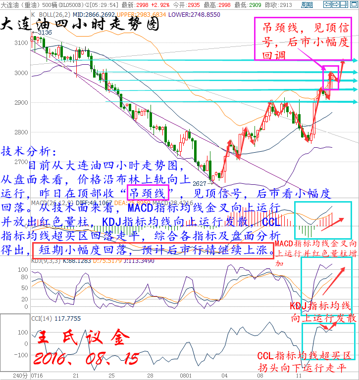 給自己留了后路相當于是勸自己不要全力以赴,資本市場都是冷血的,所有人都是獵人,所有人也都是獵物。獵食或被獵食,最終取決于自己的目光、實力和策略,當然還要有信任與執行。誰也不想給一只不下蛋的母雞喂米。 周六(8月13日),有消息稱,委內瑞拉總統馬杜羅12日呼吁所有世界產油國共同協商,將油價提升至70美元/桶。委內瑞拉當地電視臺援引馬杜羅在南美國家副總統委員會會議上的話稱:“每桶石油價格應達到70美元,從而保證石油價格的恢復,這對國際金融體系來說是必要的和不難完成的任務”。他還表示,100美元水平是公允價。委內瑞拉正在與OPEC及非OPEC產油國合作。 美國WTI原油9月期貨周五(8月12日)收漲1.00美元,或2.30%,報44.49美元/桶,本周大漲6.22%。布倫特原油10月期貨周五收漲0.93美元,或2.02%,報46.97美元/桶,本周急升6.1%。凍產傳聞再度浮現的影響仍在持續發酵,日內美元走弱也為油價提供了有效支撐,不過由于美國石油活躍鉆井數大幅增加,油價漲勢能否持續成為疑問。美國WTI原油期貨價格盤中最高觸及44.60美元/桶,布倫特原油期貨價格盤中最高觸及47.05美元/桶。 基本面利好因素: 今日有“恐怖數據”之稱的零售銷售、生產者物價指數(PPI)、密歇根大學消費者信心指數以及企業庫存與銷售數據相繼出爐。美國7月零售銷售意外遠不及市場預期,生產者物價指數(PPI)則創下近一年最大跌幅。令人失望的美國7月零售銷售數據公布之后,三季度經濟增速預期遭到下調,市場愈發預期美聯儲今年將不急于加息。數據出爐之后,金融市場掀起巨瀾,美元指數遭受痛擊,短線重挫。美元走弱為油價提供了有效支撐。 交易員指出,中國7月原油產量下降8.1%至1672萬噸,為5年來最低水平,這對于原油市場是一大利好,因這或許表明亞洲最大經濟體將進口更多原油。 沙特能源部長法利赫(Khalid al-Falih)昨日表示,將在下個月與OPEC和非OPEC產油國會面,討論油市問題,凍產計劃再次浮上水面。國際能源論壇將于9月26日-28日在阿爾及利亞舉行,卡塔爾油長此前曾表示OPEC成員國將在論壇會議間隙展開討論。 國際能源署(IEA)月報稱,世界各地的煉廠第三季度將加工創紀錄的原油,在今年第二季度煉廠原油需求創下2009年以來最大跌幅之后,本季度需求將反彈。IEA同時,石油輸出國組織(OPEC)成員國之間互相競爭,以保障市場份額,在這種情況下,即便沙特、科威特和阿聯酋原油產量位于歷史新高,但煉廠需求的回升將有助于吸收原油庫存。整體而言,IEA此次公布的月報中利多因素大于利空因素,因此對油價提供了強勁支撐。 美國能源信息署(EIA)最新數據顯示,截至8月5日當周,美國汽油庫存減少280.7萬桶,至2.3538億桶,市場預估為減少106.3萬桶,而精煉油庫存減少195.9萬桶,至1.512億桶,市場預估為增加51.3萬桶,精煉油庫存降幅為5月13日當周以來最大。此外,美國國內原油產量減少1.5萬桶至844.5萬桶/日。 大連油技術分析: 技術分析: 目前從大連油四小時走勢圖,從盤面來看,價格沿布林上軌向上運行,昨日在頂部收“吊頸線”,見頂信號,后市看小幅度回落。從技術面來看,MACD指標均線金叉向上運行并放出紅色量柱,KDJ指標均線向上運行發散,CCL指標均線超買區回落走平,綜合各指標及盤面分析得出,短期小幅度回落,預計后市行情繼續上漲。 操作建議: 今日大連油整體趨勢以逢低做多為主,以高空為輔。 日內阻力:3045/3075 日內支撐:2965/2935 激進者空單3000~2990區間內可以考慮擇機入場做空,止損3030上方,目標2965/2935。 穩健者空單3045~3055區間內可以考慮擇機入場做空,止損3085上方,目標3000/2965。 激進者多單2975~2985區間內可以考慮擇機入場做多,止損2945下方,目標3045/3075。 穩健者多單2945~2955區間內可以考慮擇機入場做多,止損2915下方,目標2985/3045。 以上操作建議僅供參考、投資有風險、操作需謹慎。 【以上建議出自中匯天融分析部,以實盤操作建議為準】 再生銀技術分析: (來源:王氏議金 新浪博客) 技術分析: 目前從再生銀四小時走勢圖分析,從盤面來看,價格昨日向下運行到布林中軌與下軌之間,下方關注4190支撐位。從技術面來看,布林帶開口收攏,MACD指標均線兩次死叉向下運行,KDJ指標均線死叉向下運行,CCL指標均線0軸附近拐頭向下運行,綜合各指標及盤面分析得出,價格震蕩整理,預計后市行情下跌。 操作建議: 今日再生銀整體趨勢以逢高做空為主,以低多為輔。 日內阻力:4240/4270 日內支撐:4170/4140 激進者空單4200~4210區間內可以考慮擇機入場做空,止損4240上方,目標4170/4140。 穩健者空單4230~4240區間內可以考慮擇機入場做空,止損4270上方,目標4200/4170。 激進者多單4180~4170區間內可以考慮擇機入場做多,止損4140下方,目標4230/4270。 穩健者多單4140~4150區間內可以考慮擇機入場做多,止損4110下方,目標4170/4200。 以上操作建議僅供參考、投資有風險、操作需謹慎。 【以上建議出自中匯天融分析部,以實盤操作建議為準】 今日重點關注的財經數據及事件: 10:00外交部將舉行中外媒體吹風會,邀請外交部副部長李保東、財政部副 部長朱光耀、央行副行長易綱、杭州市委書記趙一德介紹G20領導人 第十一次峰會有關情況 20:30美國8月紐約聯儲制造業指數 22:00美國8月NAHB房產市場指數 三窮三富過到老,十年興敗多少人,誰人背后無人說,誰人背后不說人!時間讓我們看清,什么是真,什么是假,喜我者,我惜之,嫌我者,我棄之。也