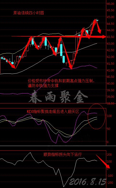 今日分析策略: 美國WTI原油9月期貨上周五(8月12日)收漲1.00美元,或2.30%,報44.49美元/桶,上周大漲6.22%。布倫特原油10月期貨上周五收漲0.93美元,或2.02%,報46.97美元/桶,上周急升6.1%。 盡管凍產傳聞影響仍在持續發酵,不過由于美國石油活躍鉆井數大幅增加,油價漲勢受限。美國油服公司貝克休斯(Baker Hughes)周五(8月12日)公布數據顯示,截至2016年8月12日當周美國石油活躍鉆井數增加15座至396座,為連續第七周增長,同時觸及2月26日以來最高水平,過去11周內有10周錄得增長。 本周四北京時間(8月18日)02:00,美聯儲將公布7月貨幣政策會議紀要。此外亞特蘭大聯儲主席洛克哈特(Dennis Lockhart)、2016年FOMC票委、圣路易斯聯儲主席布拉德(James Bullard)以及舊金山聯儲主席威廉姆斯(John Williams)均將在本周發表講話。 據彭博社周五(8月12日)公布的最新調查顯示,分析師及交易員轉而看空下周NYMEX原油價格走勢。在接受調查的36位分析師中,看多9人(25%),看空14人(39%),看平13人(36%)。 技術面分析: 原油連續從四小時走勢圖來看,布林帶開口繼續擴大,中軌和上軌向上運行,下軌拐頭向下,K線價格自下軌處受支撐上行,突破中軌觸及上軌,價格沿上軌震蕩上行,目前價格在45美元下方運行。KDJ指標聚攏并走緩,且K、D、J三線進入80上方超買區,CCI順勢指標拐頭向下運行。綜合來看,K線價格受布林帶上軌和前期高點強力壓制,下跌動能較足,預計今日早盤油價將震蕩下行。 8.15美原油操作建議: 今日早盤操作上建議高拋低吸,45美元左右做空,43.50美元附近做多。(以上建議僅供參考,風險自擔) 支撐、阻力點位分析: 美元指數 第一支撐:95.60;第二支撐:95.45; 第一阻力:95.80;第二阻力:96.00; 現貨黃金(美元/盎司) 第一支撐:1330;第二支撐:1325; 第一阻力:1340;第二阻力:1345; 現貨白銀(美元/盎司) 第一支撐:19.60;第二支撐:19.56; 第一阻力:19.80;第二阻力:19.90; (以上文章由春雨原創,轉載請注明出處。溫馨提示,投資有風險,入市需謹慎。以上僅代表春雨個人觀點,不作操作依據,據此操作風險自擔) |