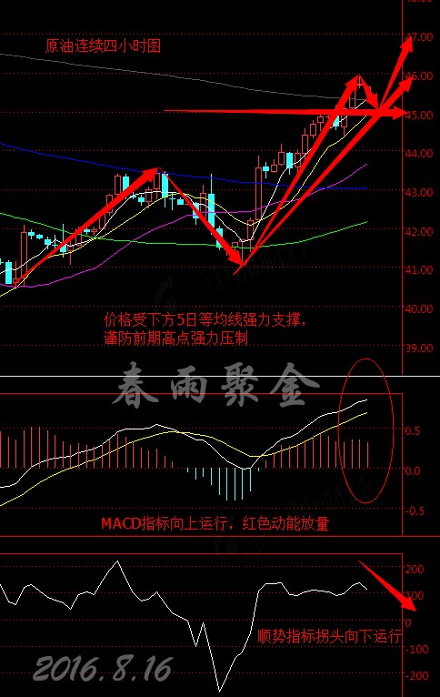 原油連續(xù)從四小時走勢圖來看,均線系統(tǒng)整體呈多頭排列,5日、10日、22日等均線一致向上運行,5日均線上穿10日均線形成金叉,且繼續(xù)上行貫穿22日、135日均線,K線價格沿5日均線震蕩上行,目前價格在45.50美元上方整理。MACD指標向上延伸,紅色動能柱不斷放量,CCI順勢指標拐頭向下運行。綜合來看,K線價格受下方5日等均線強力支撐,上漲動能較足,預計今日早盤油價小幅回落再震蕩上行。 8.16美原油操作策略: 原油回撤見45.20的位置正負0.05美金則繼續(xù)做多不變,止損放在44.60,目標則繼續(xù)看高點46-46.20的區(qū)域。(以上建議僅供參考,風險自擔) 支撐、阻力點位分析: 美元指數(shù) 第一支撐:95.50;第二支撐:95.40; 第一阻力:95.70;第二阻力:95.80; 現(xiàn)貨黃金(美元/盎司) 第一支撐:1338;第二支撐:1335; 第一阻力:1345;第二阻力:1350; 現(xiàn)貨白銀(美元/盎司) 第一支撐:19.80;第二支撐:19.70; 第一阻力:19.90;第二阻力:20.00; (以上文章由本人春雨撰寫,轉(zhuǎn)載請注明出處,溫馨提示:投資有風險,入市需謹慎,建議僅供參考!) |