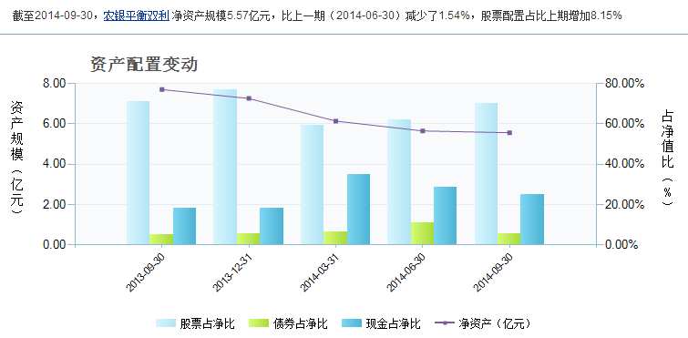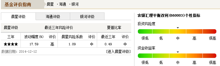 基金全稱:農銀匯理平衡雙利混合型證券投資基金 基金簡稱:農銀平衡雙利 基金代碼:660003(前端) 基金類型:混合型 發行日期:2009年03月02日 成立日期/規模:2009年04月08日 / 64.655億份 資產規模:5.57億元(截止至:2014年09月30日) 份額規模:4.5550億份(截止至:2014年09月30日) 基金管理人:農銀匯理基金 基金托管人:交通銀行 基金經理人:陳富權 成立來分紅:每份累計0.19元(3次) 管理費率:1.50%(每年) 托管費率:0.25%(每年) 最高申購費率:1.50%(前端) 最高贖回費率:0.50%(前端) 業績比較基準:55%×滬深300指數+45%×中信全債指數