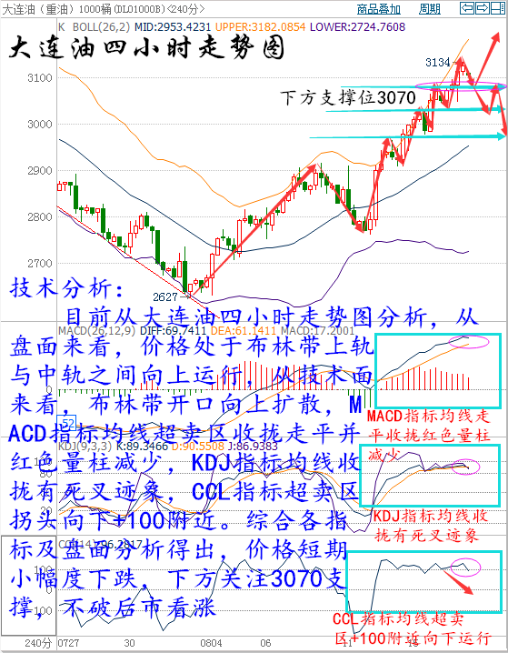 基本面利好因素: 美國勞工部公布的數據顯示,美國7月季調后CPI月率上升0%,升幅創今年2月以來最低,因汽油價格錄得五個月來的首次下跌,表明美國潛在通脹壓力溫和,這可能會進一步削弱美聯儲的年內加息前景。雖然美聯儲“三號人物”、紐約聯儲主席杜德利的鷹派講話嚇壞市場,但美元日內依然回落,這為油價提供了有效支撐。 沙特能源部長法利赫(Khalid al-Falih)近期表示,將在下個月與OPEC和非OPEC產油國會面,討論油市問題,凍產計劃再次浮上水面。國際能源論壇將于9月26日-28日在阿爾及利亞舉行,卡塔爾油長此前曾表示OPEC成員國將在論壇會議間隙展開討論。同時俄羅斯能源部長諾瓦克(Alexander Novak)周一(8月15日)在接受沙特《中東日報》采訪時稱,如果有必要,俄羅斯就與石油輸出國組織(OPEC)合作穩定油價持開放態度,這令市場信心大受鼓舞。 尼日利亞又出現了一個新的武裝組織,聲稱已炸毀了該國的重要輸油管,并警告更多的襲擊將陸續有來。尼日利亞當地激進分子曾經在過去數月內襲擊原油和能源設施,這導致產量大減,目前已經削減了近70萬桶/日,7月出口量仍大幅低于2016年初的每日200萬桶水平。此外,由于哈里加港抗議事件,7月份利比亞產量小幅下降,因主要油田Sarir運營中斷。委內瑞拉的供應則因現金緊缺承受下行壓力,7月產量也進一步下滑,今年產量恐創14年來最大降幅。 IEA月報稱,世界各地的煉廠第三季度將加工創紀錄的原油,在今年第二季度煉廠原油需求創下2009年以來最大跌幅之后,本季度需求將反彈。IEA同時,石油輸出國組織(OPEC)成員國之間互相競爭,以保障市場份額,在這種情況下,即便沙特、科威特和阿聯酋原油產量位于歷史新高,但煉廠需求的回升將有助于吸收原油庫存。整體而言,IEA此次公布的月報中利多因素大于利空因素,因此對油價提供了強勁支撐。 美國能源信息署(EIA)最新數據顯示,截至8月5日當周,美國汽油庫存減少280.7萬桶,至2.3538億桶,市場預估為減少106.3萬桶,而精煉油庫存減少195.9萬桶,至1.512億桶,市場預估為增加51.3萬桶,精煉油庫存降幅為5月13日當周以來最大。此外,美國國內原油產量減少1.5萬桶至844.5萬桶/日。 美原油技術分析 美原油從四小時圖來看,布林帶開口,K線價格運行在布林帶上軌附近,MACD指標高位超買,快慢線交叉向上運行,紅色能量柱放量,RSI指標高位超買有向下運行的趨勢,KDJ指標高位走平粘合。綜合來看,后期行情回落看漲,操作思路,低多為主! 原油操作建議: 1、44.8-44.9附近做多,目標看46.3-46.4,默認止損 2、46.4-46.5附近做空,目標看45.5-45.6,默認止損 大連油技術分析