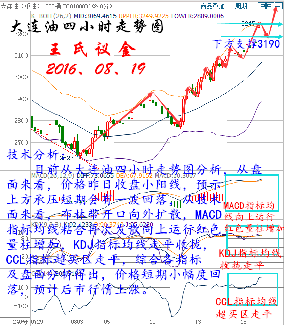 投資最遺憾的,莫過(guò)于輕易地放棄了不該放棄的,固執(zhí)地堅(jiān)持了不該堅(jiān)持的。強(qiáng)勢(shì)人格是內(nèi)在的傲骨,而不是外在的傲氣,成長(zhǎng)的路沒(méi)有捷徑,只是頓悟的早晚,人生最怕的不是錯(cuò)了,而是明知是個(gè)坑還總幻象奇跡,把偶發(fā)事件當(dāng)成了憧憬對(duì)象,真正的高手就如我一樣清晰的知道狙擊的時(shí)擊和方向。 美國(guó)WTI原油9月期貨周四(8月18日)收漲1.43美元,或3.06%,報(bào)48.22美元/桶,自8月初低點(diǎn)累計(jì)反彈22%,收盤(pán)后正式進(jìn)入牛市。布倫特原油10月期貨周四收漲1.04美元,或2.09%,報(bào)50.89美元/桶。市場(chǎng)對(duì)下月產(chǎn)油國(guó)會(huì)議達(dá)成產(chǎn)量限制協(xié)議的押注仍在增加,大量的空頭回補(bǔ)操作幫助油價(jià)進(jìn)一步走高,而美元承壓回落也為油價(jià)提供了一定支撐。美國(guó)WTI原油期貨價(jià)格盤(pán)中最高觸及48.38美元/桶,布倫特原油期貨價(jià)格盤(pán)中最高觸及51.05美元/桶。 基本面利好因素: 由于美聯(lián)儲(chǔ)7月會(huì)議紀(jì)要意外不及預(yù)期鷹派且日內(nèi)公布的經(jīng)濟(jì)數(shù)據(jù)良莠不齊,美元指數(shù)延續(xù)跌勢(shì)至七周低位。雖然截至8月13日當(dāng)周首次申請(qǐng)失業(yè)救濟(jì)人數(shù)減少4000人,降至26.2萬(wàn)人,創(chuàng)下一個(gè)月以來(lái)最低水平,但費(fèi)城聯(lián)儲(chǔ)8月新訂單指數(shù),以及就業(yè)分項(xiàng)全線暴跌,尤其是就業(yè)分項(xiàng)指數(shù)更是創(chuàng)下7年以來(lái)的低位。美元承壓回落為油價(jià)提供了一定支撐。 美國(guó)能源信息署(EIA)數(shù)據(jù)顯示,截至8月12日當(dāng)周美國(guó)原油庫(kù)存減少250.8萬(wàn)桶,市場(chǎng)預(yù)估為增加52.2萬(wàn)桶。美國(guó)EIA原油庫(kù)存結(jié)束連續(xù)三周的增長(zhǎng)趨勢(shì),并錄得7月8日當(dāng)周以來(lái)最大降幅。美國(guó)上周汽油庫(kù)存減少272.4萬(wàn)桶,市場(chǎng)預(yù)估為減少163.8萬(wàn)桶,創(chuàng)下四周以來(lái)最大降幅。同時(shí)庫(kù)欣庫(kù)存減少72.4萬(wàn)桶,為兩周以來(lái)最大降幅。不過(guò)上周美國(guó)國(guó)內(nèi)原油產(chǎn)量增加15.2萬(wàn)桶至859.7萬(wàn)桶/日,但依然連續(xù)19周維持在900萬(wàn)桶/日關(guān)口下方。此外,美國(guó)精煉油庫(kù)存增加193.9萬(wàn)桶,市場(chǎng)預(yù)估為減少74.2萬(wàn)桶,為九周以來(lái)最大增幅。 沙特能源部長(zhǎng)法利赫(Khalid al-Falih)近期表示,將在下個(gè)月與OPEC和非OPEC產(chǎn)油國(guó)會(huì)面,討論油市問(wèn)題,凍產(chǎn)計(jì)劃再次浮上水面。國(guó)際能源論壇將于9月26日-28日在阿爾及利亞舉行,卡塔爾油長(zhǎng)此前曾表示OPEC成員國(guó)將在論壇會(huì)議間隙展開(kāi)討論。同時(shí)俄羅斯能源部長(zhǎng)諾瓦克(Alexander Novak)周一(8月15日)在接受沙特《中東日?qǐng)?bào)》采訪時(shí)稱(chēng),如果有必要,俄羅斯就與石油輸出國(guó)組織(OPEC)合作穩(wěn)定油價(jià)持開(kāi)放態(tài)度,這令市場(chǎng)信心大受鼓舞。 尼日利亞又出現(xiàn)了一個(gè)新的武裝組織,聲稱(chēng)已炸毀了該國(guó)的重要輸油管,并警告更多的襲擊將陸續(xù)有來(lái)。尼日利亞當(dāng)?shù)丶みM(jìn)分子曾經(jīng)在過(guò)去數(shù)月內(nèi)襲擊原油和能源設(shè)施,這導(dǎo)致產(chǎn)量大減,目前已經(jīng)削減了近70萬(wàn)桶/日,7月出口量仍大幅低于2016年初的每日200萬(wàn)桶水平。此外,由于哈里加港抗議事件,7月份利比亞產(chǎn)量小幅下降,因主要油田Sarir運(yùn)營(yíng)中斷。委內(nèi)瑞拉的供應(yīng)則因現(xiàn)金緊缺承受下行壓力,7月產(chǎn)量也進(jìn)一步下滑,今年產(chǎn)量恐創(chuàng)14年來(lái)最大降幅。 IEA月報(bào)稱(chēng),世界各地的煉廠第三季度將加工創(chuàng)紀(jì)錄的原油,在今年第二季度煉廠原油需求創(chuàng)下2009年以來(lái)最大跌幅之后,本季度需求將反彈。IEA同時(shí),石油輸出國(guó)組織(OPEC)成員國(guó)之間互相競(jìng)爭(zhēng),以保障市場(chǎng)份額,在這種情況下,即便沙特、科威特和阿聯(lián)酋原油產(chǎn)量位于歷史新高,但煉廠需求的回升將有助于吸收原油庫(kù)存。整體而言,IEA此次公布的月報(bào)中利多因素大于利空因素,因此對(duì)油價(jià)提供了強(qiáng)勁支撐。 大連油技術(shù)分析: 技術(shù)分析: 目前從大連油四小時(shí)走勢(shì)圖分析,從盤(pán)面來(lái)看,價(jià)格昨日收盤(pán)小陽(yáng)線,預(yù)示上方承壓短期會(huì)有一波回落,從技術(shù)面來(lái)看,布林帶開(kāi)口向外擴(kuò)散,MACD指標(biāo)均線粘合再次發(fā)散向上運(yùn)行紅色量柱增加,KDJ指標(biāo)均線走平收攏,CCL指標(biāo)均線超買(mǎi)區(qū)走平,綜合各指標(biāo)及盤(pán)面分析得出,價(jià)格短期小幅度回落,預(yù)計(jì)后市行情上漲。 操作建議: 今日大連油整體趨勢(shì)逢高做空為主,以低多為輔。 日內(nèi)阻力:3270/3310 日內(nèi)支撐:3200/3170 激進(jìn)者空單3260~3270區(qū)間內(nèi)可以考慮擇機(jī)進(jìn)場(chǎng)做空,止損3300上方,目標(biāo)3230/3200。 穩(wěn)健者空單3300~3310區(qū)間內(nèi)可以考慮擇機(jī)進(jìn)場(chǎng)做空,止損3340上方,目標(biāo)3270/3240。 激進(jìn)者多單3200~3210區(qū)間內(nèi)可以考慮擇機(jī)進(jìn)場(chǎng)