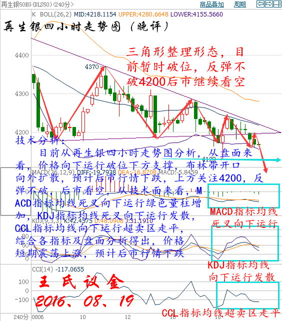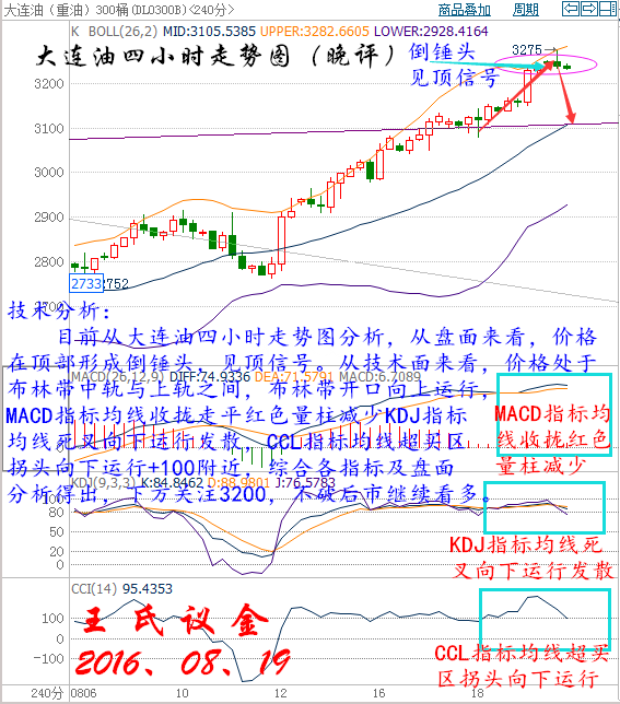 周五(8月19日)原油盤初,美油小幅上漲,交投于48.25美元/桶附近,漲幅約為0.06%;布油小幅下跌,交投于50.76美元/桶附近,跌幅約為0.26%。凍產(chǎn)預(yù)期,空頭回補(bǔ)及美元走強(qiáng)等因素促使近期油價(jià)不斷上漲,但是,凍產(chǎn)前沙特8月原油產(chǎn)量創(chuàng)新高,令市場對凍產(chǎn)心存疑慮。再加之供需面上,原油和成品油庫存高企的現(xiàn)狀尚未改變,市場交投仍需謹(jǐn)慎。周四OPEC凍產(chǎn)預(yù)期的持續(xù)發(fā)酵,加之美元的持續(xù)下跌助推油價(jià)上漲,美油連續(xù)六日收漲,且布倫特原油六周來首次升穿50美元。 從供需面上看,美國煉油廠的原油需求在第四季度可能會(huì)下滑,因?yàn)槟菚r(shí)候?qū)⑦M(jìn)入煉油設(shè)備的常規(guī)維護(hù)期。上周美國石油儲(chǔ)備凈增加130萬桶表明市場供應(yīng)過剩問題仍然很嚴(yán)重。在市場恢復(fù)健康平衡之前,原油供應(yīng)過剩導(dǎo)致的庫存高企壓力需要被消化掉。從消息面上看,國際能源論壇將于9月26日-28日在阿爾及利亞舉行。OPEC可能在下個(gè)月與非OPEC產(chǎn)油國會(huì)晤時(shí)恢復(fù)凍產(chǎn)磋商,委內(nèi)瑞拉再次呼吁凍產(chǎn),沙特表示支持價(jià)格支撐舉措。俄羅斯和OPEC能源官員在維也納進(jìn)行了會(huì)晤,討論了油市。這些利好消息持續(xù)發(fā)酵,令凍產(chǎn)預(yù)期不斷升溫,緩解了市場對于油價(jià)再一次瀕臨暴跌邊緣的恐懼,美油和布油從8月初觸及的低位已經(jīng)上漲逾20%。 大連油技術(shù)分析: 技術(shù)分析: 目前從大連油四小時(shí)走勢圖分析,從盤面來看,價(jià)格在頂部形成倒錘頭,見頂信號(hào)。從技術(shù)面來看,價(jià)格處于布林帶中軌與上軌之間,布林帶開口向上運(yùn)行,MACD指標(biāo)均線收攏走平紅色量柱減少KDJ指標(biāo)均線死叉向下運(yùn)行發(fā)散,CCL指標(biāo)均線超買區(qū)拐頭向下運(yùn)行+100附近,綜合各指標(biāo)及盤面分析得出,下方關(guān)注3200,不破后市繼續(xù)看多。 操作建議: 今晚大連油整體操作思路以逢低做多為主,以高空為輔。 日內(nèi)阻力:3250/3280 日內(nèi)支撐:3200/3160 激進(jìn)者空單3230~3240區(qū)間內(nèi)可以考慮擇機(jī)入場做空,止損3270上方,目標(biāo)3200/3160。 穩(wěn)健者空單3270~3280區(qū)間內(nèi)可以考慮擇機(jī)入場做空,止損3300上方,目標(biāo)3240/3210。 激進(jìn)者多單3190~3200區(qū)間內(nèi)可以考慮擇機(jī)入場做多,止損3160下方,目標(biāo)3230/3260。 穩(wěn)健者多單3160~3170區(qū)間內(nèi)可以考慮擇機(jī)入場做多,止損3130下方,目標(biāo)3200/3240。 以上操作建議僅供參考、投資有風(fēng)險(xiǎn)、操作需謹(jǐn)慎。 【以上建議出自中匯天融分析部,以實(shí)盤操作建議為準(zhǔn)】 再生銀技術(shù)分析: 技術(shù)分析: 目前從再生銀四小時(shí)走勢圖分析,從盤面來看,價(jià)格向下運(yùn)行破位下方支撐,布林帶開口向外擴(kuò)散,預(yù)計(jì)后市行情下跌,上方關(guān)注4200,反彈不破,后市看空,從技術(shù)面來看,MACD指標(biāo)均線死叉向下運(yùn)行綠色量柱增加,KDJ指標(biāo)均線死叉向下運(yùn)行發(fā)散,CCL指標(biāo)均線向下運(yùn)行超賣區(qū)走平,綜合各指標(biāo)及盤面分析得出,價(jià)格短期震蕩上漲,預(yù)計(jì)后市行情下跌。 操作建議: 今晚再生銀整體趨勢以逢高做空為主,以低多為輔。 日內(nèi)阻力:4200/4250 日內(nèi)支撐:4150/4130 激進(jìn)者空單4180~4170區(qū)間內(nèi)可以考慮擇機(jī)入場做空,止損4210上方,目標(biāo)4140/4100。 穩(wěn)健者空單4220~4210區(qū)間內(nèi)可以考慮擇機(jī)入場做空,止損4250上方,目標(biāo)4170/4130。 激進(jìn)者多單4150~4140區(qū)間內(nèi)可以考慮擇機(jī)入場做多,止損4110下方,目標(biāo)4190/4220。 穩(wěn)健者空單4100~4110區(qū)間內(nèi)可以考慮擇機(jī)入場做多,止損4070下方,目標(biāo)4150/4190。 以上操作建議僅供參考、投資有風(fēng)險(xiǎn)、操作需謹(jǐn)慎。 【以上建議出自中匯天融分析部,以實(shí)盤操作建議為準(zhǔn)】 三窮三富過到老,十年興敗多少人,誰人背后無人說,誰人背后不說人!時(shí)間讓我們看清,什么是真,什么是假,喜我者,我惜之,嫌我者,我棄之。也許你很牛,但我未必在乎你,也許你啥也不是,但我不嫌棄你,你為我付出,我必對的起你,你敢在我身上賭。我會(huì)拼命讓你贏!這就是以心換心!珍惜身邊對你好的每個(gè)人! 本文僅代表王氏議金個(gè)人觀點(diǎn),不同平臺(tái)注意價(jià)格的換算,撰稿人:王氏議金! |