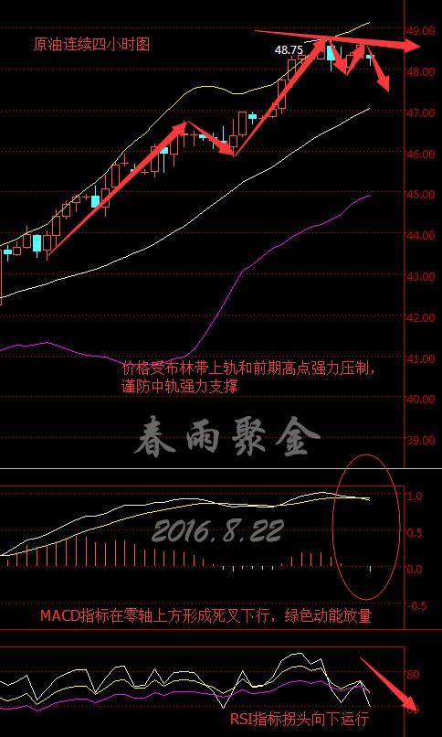 原油連續從四小時走勢圖來看,布林帶整體向上運行,上、中、下三軌一致向上,K線價格自上軌處承壓回落,目前在48美元上方高位整體。 MACD指標在零軸上方形成死叉且繼續向下運行,綠色動能柱不斷放量,RSI指標拐頭向下運行。綜合來看,K線價格受布林帶上軌和前期高點強力壓制,謹防中軌強力支撐,預計今日早盤油價將震蕩下行。 8.22美原油操作策略: 今日早盤操作上建議高拋低吸,48.70美元左右做空,47.50美元附近做多。(以上建議僅供參考,風險自擔) 支撐、阻力點位分析: 美元指數 第一支撐:94.50;第二支撐:94.60; 第一阻力:95.00;第二阻力:95.10; 現貨黃金(美元/盎司) 第一支撐:1332;第二支撐:1330; 第一阻力:1336;第二阻力:1340; 現貨白銀(美元/盎司) 第一支撐:18.80;第二支撐:18.70; 第一阻力:18.90;第二阻力:19.00; (以上文章由春雨原創,轉載請注明出處。溫馨提示,投資有風險,入市需謹慎。以上僅代表春雨個人觀點,不作操作依據,據此操作風險自擔) |
