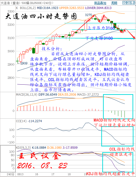 美國WTI原油10月期貨周一(8月22日)收跌1.47美元,或3.03%,報47.05美元/桶。布倫特原油10月期貨周一收跌1.72美元,或3.38%,報49.16美元/桶。中國燃油出口大增以及伊拉克和尼日利亞原油出口增加,均令原油市場供應過剩擔憂再度升溫,同時美國上周石油活躍鉆井數連續第八周增加,令投資者擔憂油價接近50美元關口激發了美國產油商的增產意愿,此外,美元回升也令油價承受了一定壓力。美國WTI原油期貨價格盤中最低觸及47.36美元/桶,布倫特原油期貨價格盤中最低觸及49.11美元/桶。 基本面利好因素: 能源情報監測機構Genscape最新數據顯示,上周美國原油主要交割地庫欣地區庫存減少18.7萬桶,這為市場情緒提供了一定支撐。 美國能源信息署(EIA)數據顯示,截至8月12日當周美國原油庫存減少250.8萬桶,市場預估為增加52.2萬桶。美國EIA原油庫存結束連續三周的增長趨勢,并錄得7月8日當周以來最大降幅。美國上周汽油庫存減少272.4萬桶,市場預估為減少163.8萬桶,創下四周以來最大降幅。同時庫欣庫存減少72.4萬桶,為兩周以來最大降幅。不過上周美國國內原油產量增加15.2萬桶至859.7萬桶/日,但依然連續19周維持在900萬桶/日關口下方。此外,美國精煉油庫存增加193.9萬桶,市場預估為減少74.2萬桶,為九周以來最大增幅。 沙特能源部長法利赫(Khalid al-Falih)近期表示,將在下個月與OPEC和非OPEC產油國會面,討論油市問題,凍產計劃再次浮上水面。國際能源論壇將于9月26日-28日在阿爾及利亞舉行,卡塔爾油長此前曾表示OPEC成員國將在論壇會議間隙展開討論。同時俄羅斯能源部長諾瓦克(Alexander Novak)周一(8月15日)在接受沙特《中東日報》采訪時稱,如果有必要,俄羅斯就與石油輸出國組織(OPEC)合作穩定油價持開放態度,這令市場信心大受鼓舞。 基本面利空因素: 美聯儲二號人物費希爾周日表示,聯儲正接近達成就業和通脹目標。盡管費希爾并未指出美聯儲下次應何時加息,分析師們表示其評論預示著美聯儲主席耶倫周五將發表鷹派言論。同時日本產經新聞周末引述日本央行(BOJ)行長黑田東彥(Haruhiko Kuroda)的話報導稱,日本央行不排除進一步調降負利率的可能性。受這兩大利好的推動,美元指數今日出現反彈走強跡象,這令油價承受一定壓力。 中國海關周一(8月22日)公布的數據顯示,中國7月柴油出口同比暴增181.8%,達到153萬噸,是2015年平均單月出口量的近三倍。汽油出口同比勁升145%,至97萬噸,略低于6月的紀錄高位110萬噸。此外,煤油出口同比跳升46%至109萬噸。這令市場煉油產品利潤承受重壓,恐加重煉油產品的供應過剩問題。 伊拉克北部國營石油公司(NOC)石油和能源委員會成員Fouad Hussein上周日(8月21日)在電話中稱,隨著Baba Gorgor, Jambour以及Khabbaz油田出口的恢復,伊拉克的總原油出口將增加約15萬桶/日。此前這三座油田由NOC運營,但其用于出口的油管則被半自治的的庫爾德斯坦地區政府(KRG)控制。 一個尼日利亞武裝組織近日表示,已經做好與政府對話以及達成;饏f議的準備,這則消息顯著改善了市場對該國原油產量形勢的擔憂情緒。該組織曾對近期多次尼日爾三角洲原油設施襲擊事件宣稱負責。 美國油服公司貝克休斯(Baker Hughes)周五(8月19日)公布數據顯示,截至2016年8月19日當周美國石油活躍鉆井數增加10座至406座,為連續第八周增長,過去12周內有11周錄得增長。截至8月19日當周美國石油和天然氣活躍鉆井總數增加10座至491座,較去年同期減少394座。 大連油技術分析: 技術分析: 目前從大連油四小時走勢圖分析,從盤面來看,價格在頂部形成雙頂,昨日收盤布林中軌下方,說明上方承壓,預計短期價格回調,從盤面來看,布林帶開口收攏走平,MACD指標均線死叉向下運行綠色量柱增加,KDJ指標均線超賣區走平,CCL指標均線超賣區走平。王氏議金綜合各指標及盤面分析得出,預計短期價格小幅度上漲,后市行情看跌。 操作建議: 今日大連油整理操作趨勢以逢高做空為主,以低多為輔。 日內阻力:3170/3200 日內支撐:3100/3070 激進者空單3140~3150區間內可以考慮擇機入場做空,止損3180上方,目標3110/3080。 穩健者空單3170~3180區間內可以考慮擇機入場做空,止損3210上方,目標3140/3110。 激進者多單3110~3100區間內可以考慮擇機入場做多,止損3070下方,目標3140/3170。 穩健者多單3070~3080區間內可以考慮擇機入場做多,止損3040下方,目標3110/3140。 以上操作建議僅供參考、投資有風險、操作需謹慎。 【以上建議出自中匯天融分析部,以實盤操作建議為準】 再生銀技術分析: 技術分析: 目前從再生銀四小時走勢圖分析,從盤面來看,價格在底部形成雙底,上方關注4090壓力位,反彈不破后市繼續看空。從技術面來看,布林帶開口向外擴散,MACD指標均線收攏走平綠色量柱減少,KDJ指標均線收攏粘合走平,CCL指標均線超賣區拐頭向上運行穿破-100向上運行,王氏議金綜合各指標及盤面分析得出,價格短期小幅度上漲,上方關注4090壓力位,不破后市繼續看空。 操作建議: 今日再生銀整理操作趨勢以逢高做空為主,以低多為輔。 日內阻力:4090/4130 日內支撐:4050/4000 激進者空單4090~4080區間內可以考慮擇機入場做空,止損4120上方,目標4050/4030。 穩健者空單4130~4120區間內可以考慮擇機入場做空,止損4150上方,目標4090/4060。 激進者多單4050~4040區間內可以考慮擇機入場做多,止損4010下方,目標4090/4130。 穩健者多單4000~3990區間內可以考慮擇機入場做多,止損3960下方,