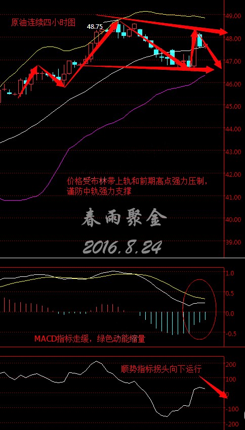 原油連續從四小時走勢圖來看,布林帶逐漸走緩且開口收攏,下軌和中軌繼續向上,上軌拐頭向下,K線價格受下軌強力支撐上行并突破中軌,但上漲動能不足,目前價格在中軌(47.50美元)附近徘徊。 MACD指標在零軸上方相對走緩,綠色動能縮量但較充足,CCI順勢指標拐頭向下運行。綜合來看。K線價格受布林帶上軌和前期高點強力壓制,但謹防中軌強力支撐,預計今日早盤油價將震蕩下行。 8.24美原油操作策略: 今日操作上建議高拋低吸,48美元左右做空,46.70美元附近做多。(以上建議僅供參考,風險自擔) 【今日重點關注的財經數據與事件】2016年8月24日 周三 ① 14:00 德國第二季度未季調GDP年率終值 、 21:00 美國6月FHFA房價指數月率 、 22:00 美國7月成屋銷售總數年化 、 22:30 美國至8月19日當周EIA原油庫存 (以上文章由春雨原創,轉載請注明出處。溫馨提示,投資有風險,入市需謹慎。以上僅代表春雨個人觀點,不作操作依據,據此操作風險自擔) |
