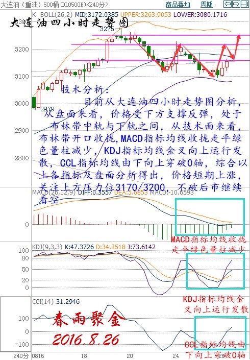 消息面 周四(8月25日),國際油價開啟震蕩上行模式,美國WTI原油10月期貨收漲0.56美元,或1.20%,報47.33美元/桶。布倫特原油10月期貨收漲0.62美元,或1.26%,報49.67美元/桶。伊朗石油部長贊加內表示將參加下月的OPEC會談,提振了市場對凍產協議達成的信心。加之,中國原油庫存降至三年低點,緩解了市場對供應過剩的擔憂。然而周五凌晨沙特能源大臣法利赫的一番講話再為油市蒙上一層陰影。OPEC秘書長巴爾金都也將在不久的未來訪問伊朗,共商維穩油市事宜。此前伊朗對是否與會持搖擺不定的態度,伊朗的參會意味著OPEC內部達成一致意見的可能性在增加。 4月多哈會議的無果而終通常被認為是沙特阿拉伯主導的凍產計劃不太可能成功的最佳例證。然而,現狀卻是沙特參與凍產協議的可能性正在增加。 此前,沙特在油市的一系列行動均是為了對抗美國頁巖油,從而保住自己的市場份額。2014年,沙特占全球石油產量的比例從10.6%下降至10%,而整個石油輸出國組織(OPEC)的市場份額也從32.7%下滑至32.3%。與此相反,美國則持續增產。 最近,OPEC凍產傳聞鬧得沸沸揚揚,國際油價再次反彈。到時OPEC主要產油國都將在阿爾及利亞首都阿爾及爾舉行會議,就凍產協議展開討論。 而沙特介于當前的現狀,也迫不及待的想要參加此次會議,而不會像之前4月的多哈會議一樣,明目張膽的放鴿子。這次俄羅斯也將加入凍產,以阻止油價進一步下滑。但在上一輪多哈會議上凍產希望破滅后,每個人都有點提心吊膽。 8月26日(周五)現貨原油技術面分析: 日線圖上收取一根光頭陽線,MA5/MA10均線交死叉運行首要于47.5附近施壓,下方首要支撐在昨日晚間大幅拉升之后回踩未跌下去的46.8附近,重點支撐還是在昨日低點46.4位置以及46關鍵位置,MACD指標依然是上行減緩,紅色量能縮減。 4小時圖上看布林帶成縮口之勢,目前布林中軌首要于47.5附近施壓,MA5/MA10均線交金叉于47附近形成首要支撐,布林下軌依然于46位置形成關鍵支撐,MACD指標于0軸下方粘合運行,綠色量能縮減即將耗盡,指標中性;綜合分析來看,春雨老師認為,原油回落修正46位置依然不到位,而上行力度已無之前那樣強勢,短期內或將進入區間整理,關注46-48區間,春雨老師建議日內維持此區間內采取高空低多策略即可,還是在強調一遍,目前市場總是圍繞下月OPEC會議以及晚間的耶倫演講出現突發消息,導致油價走勢也很不穩定,一定要注意做好風險控制! 8月26日(周五)現貨原油操作指導: 1、早盤下方觸及47.00美元輕倉做多,止損0.3美元,目標看47.5-47.8美元; 2、早盤上方觸及47.50美元輕倉做空,止損0.3美元,目標看47.0-47.1美元; 大連油技術面: