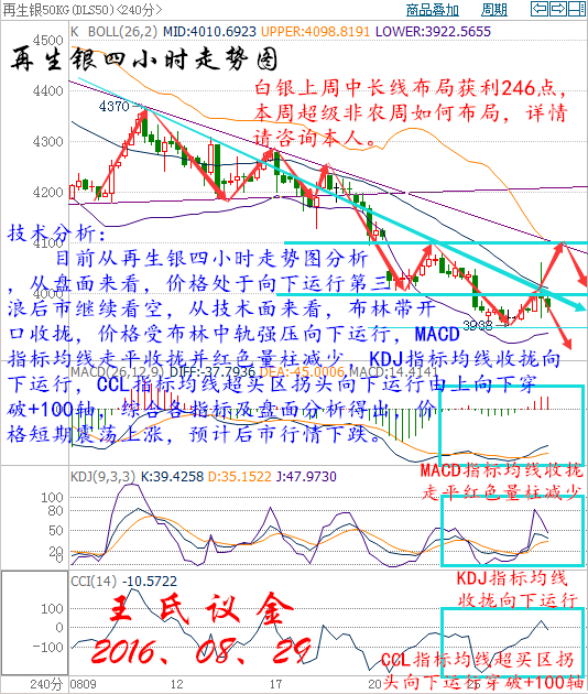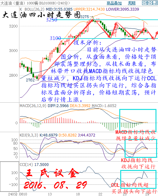 上周收盤: 美國WTI原油10月期貨周五(8月26日)收漲0.31美元,或0.65%,報(bào)47.64美元/桶,本周下挫3.48%。布倫特原油10月期貨周五收漲0.25美元,或0.50%,報(bào)49.92美元/桶,本周下跌2.26%。美聯(lián)儲主席耶倫和副主席費(fèi)希爾的講話提振了年內(nèi)加息預(yù)期,同時(shí)也為9月加息保留了可能,這令美元強(qiáng)勢反彈,不過美國本周石油活躍鉆井?dāng)?shù)持平于上周,終結(jié)了連續(xù)八周的漲勢,為原油多頭帶來一定的信心。美國WTI原油期貨價(jià)格盤中最高觸及48.45美元/桶,布倫特原油期貨價(jià)格盤中最高觸及50.75元/桶。 大交所大連油技術(shù)分析: 技術(shù)分析: 目前從大連油四小時(shí)走勢圖分析,從盤面來看,價(jià)格處于頂部震蕩整理形態(tài),從技術(shù)面來看,布林帶開口收攏MACD指標(biāo)均線收攏綠色量柱減少,KDJ指標(biāo)均線收攏向下運(yùn)行CCL指標(biāo)均線超買區(qū)拐頭向下運(yùn)行,綜合各指標(biāo)及盤面分析得出,價(jià)格短期震蕩,預(yù)計(jì)后市行情上漲。 操作建議: 今日大連油整體操作趨勢以逢低做多為主,以高空為輔。 日內(nèi)阻力:3185/3220 日內(nèi)支撐:3120/3080 激進(jìn)者空單3150~3160區(qū)間內(nèi)可以考慮擇機(jī)入場做空,止損3185上方,目標(biāo)3120/3100。 穩(wěn)健者空單3185~3195區(qū)間內(nèi)可以考慮擇機(jī)入場做空,止損3225上方,目標(biāo)3150/3120。 激進(jìn)者多單3120~3110區(qū)間內(nèi)可以考慮擇機(jī)入場做多,止損3090下方,目標(biāo)3150/3180。 穩(wěn)健者多單3080~3070區(qū)間內(nèi)可以考慮擇機(jī)入場做多,止損3040下方,目標(biāo)3120/3150。 以上操作建議僅供參考、投資有風(fēng)險(xiǎn)、操作需謹(jǐn)慎。 【以上建議出自中匯天融分析部,以實(shí)盤操作建議為準(zhǔn)】 大交所再生銀技術(shù)分析: 技術(shù)分析: 目前從再生銀四小時(shí)走勢圖分析,從盤面來看,價(jià)格處于向下運(yùn)行第三浪后市繼續(xù)看空,從技術(shù)面來看,布林帶開口收攏,價(jià)格受布林中軌強(qiáng)壓向下運(yùn)行,MACD指標(biāo)均線走平收攏并紅色量柱減少,KDJ指標(biāo)均線收攏向下運(yùn)行,CCL指標(biāo)均線超買區(qū)拐頭向下運(yùn)行由上向下穿破+100軸,王氏議金綜合各指標(biāo)及盤面分析得出,價(jià)格短期震蕩上漲,預(yù)計(jì)后市行情下跌。 操作建議: 今日再生銀整體操作趨勢以逢高做空為主,以低多為輔。 日內(nèi)阻力:4030/4070 日內(nèi)支撐:3940/3900 激進(jìn)者空單3970~3980區(qū)間內(nèi)可以考慮擇機(jī)入場做空,止損4010上方,目標(biāo)3930/3900。 穩(wěn)健者空單4030~4040區(qū)間內(nèi)可以考慮擇機(jī)入場做空,止損4070上方,目標(biāo)4000/3970。 激進(jìn)者多單3940~3930區(qū)間內(nèi)可以考慮擇機(jī)入場做多,止損3900下方,目標(biāo)3970/4000。 穩(wěn)健者多單3900~3890區(qū)間內(nèi)可以考慮擇機(jī)入場做多,止損3860下方,目標(biāo)3940/3970。 以上操作建議僅供參考、投資有風(fēng)險(xiǎn)、操作需謹(jǐn)慎。 【以上建議出自中匯天融分析部,以實(shí)盤操作建議為準(zhǔn)】 今日可以關(guān)注的財(cái)經(jīng)數(shù)據(jù): 20:30美國7月個(gè)人支出月率 20:30美國7月核心PCE物價(jià)指數(shù)月率 20:30美國7月核心PCE物價(jià)指數(shù)年率 22:30美國8月達(dá)拉斯聯(lián)儲商業(yè)活動指數(shù) 實(shí)力讓你見證,什么是真,什么是假,喜我者,我惜之,嫌我者,我棄之。也許你很牛,但我未必在乎你,也許你啥也不是,但我不嫌棄你,你為我付出,我必對的起你,你敢在我身上賭。我會拼命讓你贏!這就是以心換心!王老師指導(dǎo)! |
