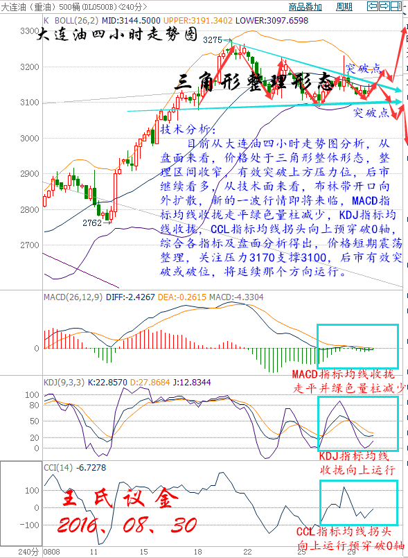 昨日收盤: 美國WTI原油10月期貨周一(8月29日)收跌0.66美元,或1.39%,報46.98美元/桶。布倫特原油10月期貨周一收跌0.66美元,或1.32%,報49.26元/桶。美聯儲官員頻發鷹派講話以及個人消費指出數據向好令美元延續漲勢,油價承壓下挫,同時中東地區原油產量持續上升加重了投資者對油市基本面的擔憂。美國WTI原油期貨價格盤中最低觸及46.62美元/桶,布倫特原油期貨價格盤中最低觸及49.16元/桶。 基本面利好因素: 能源情報監測機構Genscape數據顯示,截至8月26日一周,美國原油主要交割地庫欣地區庫存減少28.7444萬桶。 美國油服公司貝克休斯(Baker Hughes)周五(8月26日)公布數據顯示,截至2016年8月26日當周美國石油活躍鉆井數持平于406座,結束了八周連漲。美國當周天然氣活躍鉆井數減少2座至81座。截至8月26日當周美國石油和天然氣活躍鉆井總數減少2座至489座,較去年同期減少388座。 熟悉內部情況的消息人士今日指出,雖然目前尚未得知9月會議上產油國之間將討論何種產量限制方案,但伊朗方面已經釋放出了積極信號,一方面愿意參加此次會談,另一方面或進一步支持產油國之間達成的合作協議,這為原油多頭注入了一劑強心針。 基本面利空因素: 因對汽車的需求強勁,美國7月消費者支出連續第四個月上漲,直指經濟加速增長,可能為美聯儲今年升息鋪平道路。美聯儲主席耶倫周五在杰克遜霍爾舉行的全球央行行長會議上表示,因就業市場與經濟總體狀況有所改善,近幾個月加息的可能性增強。不過,她未給出具體加息時機線索。但美聯儲副主席費希爾在耶倫講話之后表示,主席耶倫日內稍早的講話與今年加息預期一致,意味著9月可能加息。在美聯儲官員鷹派言論之后,交易員押注美聯儲加息概率大幅攀升。9月加息的概率大幅攀升至44%,12月加息的概率攀升至64.9%。今日美元指數延續上周五漲勢,觸及兩周高位95.84。美元走強令油價承壓。 美國能源信息署(EIA)數據顯示,截至8月19日當周美國原油庫存增加250.1萬桶,市場預估為減少45.5萬桶,創下4月29日當周以來最大增幅。美國原油交割地庫欣庫存增加37.5萬桶,為8月5日當周以來最大增幅。美國上周汽油庫存增加3.6萬桶,市場預估為減少116.6萬桶,連續三周的下滑趨勢戛然而止。此外,美國精煉油庫存增加12.2萬桶,市場預估為增加40.0萬桶,為連續兩周錄得增加,且上周美國精煉油庫存上升至2011年以來同期最高水準。 尼日利亞尼日爾三角洲復仇者武裝組織發布聲明表示,已停止在尼日爾三角洲地區的敵對行動。該組織之前曾宣稱,對過去數月內尼日爾三角洲地區數個油氣設施的襲擊事件負責。這則消息顯著改善了市場對該國原油產量形勢的擔憂情緒。 伊拉克北部國營石油公司(NOC)石油和能源委員會成員Fouad Hussein上周日(8月21日)在電話中稱,隨著Baba Gorgor, Jambour以及Khabbaz油田出口的恢復,伊拉克的總原油出口將增加約15萬桶/日。此前這三座油田由NOC運營,但其用于出口的油管則被半自治的的庫爾德斯坦地區政府(KRG)控制。 中國海關公布的數據顯示,中國7月柴油出口同比暴增181.8%,達到153萬噸,是2015年平均單月出口量的近三倍。汽油出口同比勁升145%,至97萬噸,略低于6月的紀錄高位110萬噸。此外,煤油出口同比跳升46%至109萬噸。這令市場煉油產品利潤承受重壓,恐加重煉油產品的供應過剩問題。 華益金安天然氣技術分析: 技術分析: 目前從天然氣兩小時走勢圖,從盤面來看,價格處于上升趨勢,受下方支撐反彈向上運行,從技術面來看布林帶開口向上運行MACD指標均線死叉向下運行,RSI指標均線收攏走平,KDJ指標均線收攏走平,綜合各指標及盤面分析得出,價格短期小幅度回落,預計后市行情上漲。 操作建議: 今日天然氣整體操作趨勢以逢低做多為主,以高空為輔。 日內阻力:4880/4920 日內支撐:4830/4800 激進者空單4880~4890區間內可以考慮擇機入場做空,止損4920上方,目標4850/4830。 穩健者空單4910~4920區間內可以考慮擇機入場做空,止損4950上方,目標4880/4850。 激進者多單4830~4820區間內可以考慮擇機入場做多,止損4790下方,目標4860/4900。 穩健者多單4790~4800區間內可以考慮擇機入場做多,止損4760下方,目標4850/4880。 以上操作建議僅供參考、投資有風險、操作需謹慎。 【以上建議出自中匯天融分析部,以實盤操作建議為準】 大交所大連油技術分析: 技術分析: 目前從大連油四小時走勢圖分析,從盤面來看,價格處于三角形整體形態,整理區間收窄,有效突破上方壓力位,后市繼續看多,從技術面來看,布林帶開口向外擴散,新的一波行情即將來臨,MACD指標均線收攏走平綠色量柱減少,KDJ指標均線收攏,CCL指標均線拐頭向上預穿破0軸,綜合各指標及盤面分析得出,價格短期震蕩整理,關注壓力3170支撐3100,后市有效突破或破位,將延續那個方向運行。 操作建議: 今日大連油整體操作趨勢以逢低做多為主,以高空為輔。 日內阻力:3170/3210 日內支撐:3100/3050 激進者空單3170~3160區間內可以考慮擇機入場做空,止損3200上方,目標3140/3110。 穩健者空單3210~3220區間內可以考慮擇機入場做空,止損3250上方,目標3170/3140。 激進者多單3120~3110區間內可以考慮擇機入場做多,止損3190下方,目標3140/3170。 穩健者多單3050~3060區間內可以考慮擇機入場做多,止損3020下方,目標3100/3140。 以上操作建議僅供參考、投資有風險、操作需謹慎。 【以上建議出自中匯天融分析部,以實盤操作建議為準】 大交