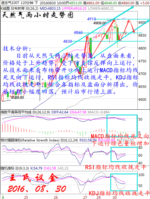 華益金安天然氣技術(shù)分析: 技術(shù)分析: 目前從天然氣兩小時走勢圖,從盤面來看,價格處于上升趨勢,受下方支撐反彈向上運行,從技術(shù)面來看布林帶開口向上運行MACD指標均線死叉向下運行,RSI指標均線收攏走平,KDJ指標均線收攏走平,綜合各指標及盤面分析得出,價格短期小幅度回落,預計后市行情上漲。