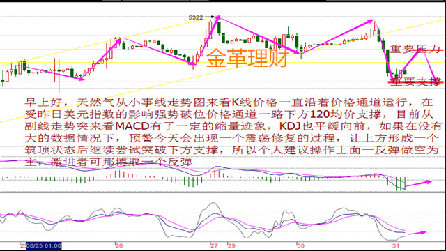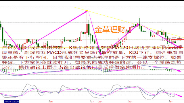 前言: 當(dāng)投資一直虧損、套單,沒有人給出合理的指導(dǎo),在投資路上迷茫了很久,感覺看透了,感覺賺不到什么錢了的時(shí)候,你不妨抬頭仰望一下天空,想一想別人為什么成功了,而你卻不行?你不妨思考一下也許是方法不對(duì),也許是沒有找到合適的老師,也或許是你沒有堅(jiān)持下去?看看金革理財(cái)對(duì)今日白銀和天然氣,技術(shù)上的分析和操作建議: 基本面分析: 周一美指漲至三周高位,另外美聯(lián)儲(chǔ)官員們近期發(fā)表言論后金融市場(chǎng)對(duì)其今年加息幾率的預(yù)期增加,令金價(jià)承壓;有分析師認(rèn)為美聯(lián)儲(chǔ)今年加息一次的幾率超80%,若周五非農(nóng)數(shù)據(jù)搶眼,9月加息的概率更大。不過金價(jià)或已處在低位,金革認(rèn)為美元漲勢(shì)必將在9月會(huì)后結(jié)束,因?yàn)槊缆?lián)儲(chǔ)不會(huì)在9月加息。 美國8月諮商會(huì)消費(fèi)者信心指數(shù)好于預(yù)期,錄得自2015年9月來最高水平,暗示家庭消費(fèi)支出仍將作為關(guān)鍵因素支撐美國經(jīng)濟(jì)增長;自今年二季度以來,消費(fèi)支出以2014年來最快速度增長,抵消了商業(yè)和政府支出的疲軟對(duì)經(jīng)濟(jì)的拖累影響。 全球最大黃金ETF--SPDR GOLD TRUST持倉較上日減少1.19噸,當(dāng)前持倉量為955.40噸。 天然氣行情分析和操作建議: 天然氣從小事線走勢(shì)圖來看K線價(jià)格一直沿著價(jià)格通道運(yùn)行,在受昨日美元指數(shù)的影響強(qiáng)勢(shì)破位價(jià)格通道一路下方120均價(jià)支撐,目前從副線走勢(shì)突來看MACD有了一定的縮量跡象,KDJ也平緩向前,如果在沒有大的數(shù)據(jù)情況下,預(yù)警今天會(huì)出現(xiàn)一個(gè)震蕩修復(fù)的過程,讓上方形成一個(gè)筑頂狀態(tài)后繼續(xù)嘗試突破下方支撐,所以金革理財(cái)建議操作上面一反彈做空為主,激進(jìn)者可那博取一個(gè)反彈。 操作建議: 5085一線不破,可多單進(jìn)場(chǎng),止損默認(rèn),目標(biāo)看5146,破位看5190 5146一線不破,空單進(jìn)場(chǎng),止損默認(rèn),目標(biāo)看5085,破位看4960 白銀行情分析和操作建議: 白銀從小時(shí)線走勢(shì)圖來看,K線價(jià)格昨日突破MA120日均價(jià)支撐后開始出現(xiàn)震蕩,副線指標(biāo)MACD形成死叉呈綠色量柱放量,KDJ下行,綜合來看白銀還是有下行空間,目前我們需要重點(diǎn)關(guān)注的是下方的一線支撐位,如果突破,下方空間會(huì)繼續(xù)打開,如果未能成功突破的話,會(huì)以一個(gè)震蕩走勢(shì)運(yùn)行,金革理財(cái)建議反彈做空為主。 操作建議: 3920壓力不破,可嘗試空單進(jìn)場(chǎng),止損默認(rèn),目標(biāo)看3890,破位持有 3890一線支撐不破,多單進(jìn)場(chǎng),止損默認(rèn),目標(biāo)看3920,破位持有 投資有風(fēng)險(xiǎn),入市需謹(jǐn)慎,建議僅供參考,請(qǐng)嚴(yán)格帶好止損止盈,盈虧自擔(dān) 文/金革理財(cái) |
