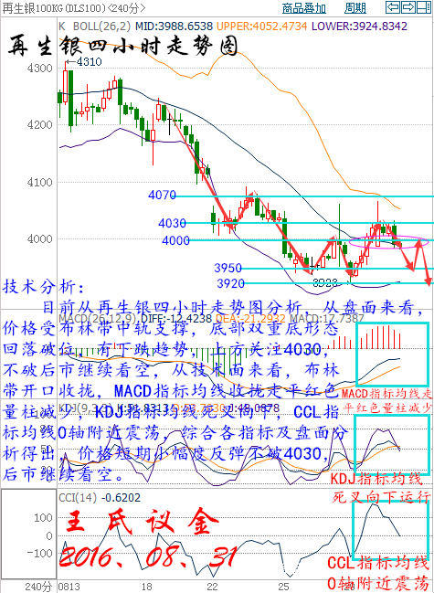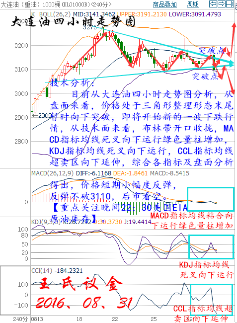昨日收盤: 美國WTI原油10月期貨周二(8月30日)收跌0.63美元,或1.34%,報46.35美元/桶。布倫特原油10月期貨周二收跌0.89美元,或1.81%,報48.37美元/桶。經濟數據向好為美元提供了上漲助力,從而令油價承壓下挫,同時伊朗可能進一步增產加重了市場的擔憂情緒,不過由于伊拉克對凍產協議的支持態度以及美國墨西哥灣油氣設施恐面臨熱帶風暴威脅等因素的存在,油價的下行空間也將暫受限制。美國WTI原油期貨價格盤中最低觸及46.23美元/桶,布倫特原油期貨價格盤中最低觸及48.51元/桶。 華益金安天然氣技術分析: 技術分析: 目前從天然氣四小時走勢圖分析,從盤面分析來看,價格處于布林帶中軌與下軌之間,從技術面來看,布林帶開口向外擴散,MACD指標均線向下運行綠色量柱減少,CCL指標均線超賣區拐頭向上運行,KDJ指標均線收攏走平,綜合各指標及盤面得出,價格短期小幅度上漲,預計后市行情下跌。 操作建議: 今日天然氣整體操作趨勢以逢高做空為主,以低多為輔。 日內阻力:4780/4840 日內支撐:4700/4650 激進者空單4780~4770區間內可以考慮擇機入場做空,止損4810上方,目標4740/4700。 穩健者空單4820~4810區間內可以考慮擇機入場做空,止損4850上方,目標4770/4740。 激進者多單4730~4740區間內可以考慮擇機入場做多,止損4700下方,目標4770/4800。 穩健者多單4640~4650區間內可以考慮擇機入場做多,止損4610下方,目標4700/4740。 以上操作建議僅供參考、投資有風險、操作需謹慎。 【以上建議出自中匯天融分析部,以實盤操作建議為準】 大交所大連油技術分析: 技術分析: 目前從大連油四小時走勢圖分析,從盤面來看,價格處于三角形整理形態末尾暫時向下突破,即將開始新的一波下跌行情,從技術面來看,布林帶開口收攏,MACD指標均線死叉向下運行綠色量柱增加,KDJ指標均線死叉向下運行,CCL指標均線超賣區向下延伸,綜合各指標及盤面分析得出,價格短期小幅度反彈,反彈不破3110,后市看空。【重點關注晚間22:30美國EIA原油庫存】。 操作建議: 今日大連油整體操作趨勢以逢高做空為主,以低多為輔。 日內阻力:3120/3160 日內支撐:3050/3000 激進者空單3100~3110區間內可以考慮擇機入場做空,止損3140上方,目標3080/3050。 穩健者空單3160~3150區間內可以考慮擇機入場做空,止損3190上方,目標3130/3100。 激進者多單3080~3070區間內可以考慮擇機入場做多,止損3050下方,目標3130/3160。 穩健者多單3050~3040區間內可以考慮擇機入場做多,止損3010下方,目標3080/3120。 以上操作建議僅供參考、投資有風險、操作需謹慎。 【以上建議出自中匯天融分析部,以實盤操作建議為準】 大交所再生銀技術分析: 技術分析: 目前從再生銀四小時走勢圖分析,從盤面來看,價格受布林帶中軌支撐,底部雙重底形態回落破位,有下跌趨勢,上方關注4030,不破后市繼續看空,從技術面來看,布林帶開口收攏,MACD指標均線收攏走平紅色量柱減少,KDJ指標均線死叉向下,CCL指標均線0軸附近震蕩,綜合各指標及盤面分析得出,價格短期小幅度反彈不破4030,后市繼續看空。 操作建議: 今日再生銀整體操作趨勢以逢高做空為主,以低多為輔。 日內阻力:4030/4070 日內支撐:3950/3920 激進者空單4030~4040區間內可以考慮擇機入場做空,止損4070上方,目標4000/3970。 穩健者空單4060~4070區間內可以考慮擇機入場做空,止損4100上方,目標4030/4000。 激進者多單4000~4010區間內可以考慮擇機入場做多,止損3970下方,目標4040/4070。 穩健者多單3960~3970區間內可以考慮擇機入場做多,止損3930下方,目標4000/4040。 以上操作建議僅供參考、投資有風險、操作需謹慎。 【以上建議出自中匯天融分析部,以實盤操作建議為準】 今日可以關注的財經數據: 04:30美國至8月26日當周API原油庫存(萬桶) 07:05英國8月Gfk消費者信心指數 14:00英國8月Nationwide房價指數月率 14:45法國8月CPI月率 15:152016年FOMC票委、波士頓聯儲主席羅森格倫(Eric Rosengren)出席上海高級金融學院主辦的會議。 15:55德國8月季調后失業人數(萬人) 15:55德國8月季調后失業率 17:00歐元區7月失業率 17:00歐元區8月CPI年率初值 20:15美國8月ADP就業人數(萬人) 20:30加拿大6月GDP月率 21:45美國8月芝加哥PMI 22:00美國7月成屋簽約銷售指數月率 22:30美國至8月26日當周EIA原油庫存(萬桶) 實力讓你見證,什么是真,什么是假,喜我者,我惜之,嫌我者,我棄之。也許你很牛,但我未必在乎你,也許你啥也不是,但我不嫌棄你,你為我付出,我必對的起你,你敢在我身上賭。我會拼命讓你贏!這就是以心換心!王老師指導! |
