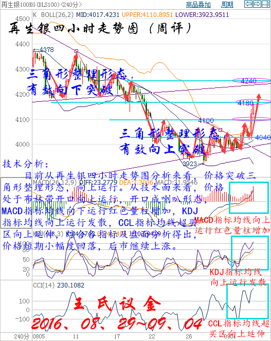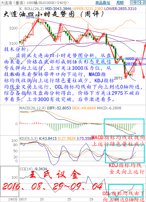 王氏寄語: 時間過的好快,一周就要說聲拜拜,轉眼進入金九銀十非常時期,一年已經揮霍過半,一生踏入而立之年。好多事還未準備,好多夢還未開始,公平于時間,也區別于時間。情商決定了成就事業的大小,執行決定了靠近夢想的距離。投資是人性的顯示器,投資也是人生的縮影,你就是主角,更是導演,所有的喜劇或悲劇都是親自勾畫的結果。 本周行情回顧: 周一(8月29日)亞歐時段油價跌逾1%,美原油10月期貨一度創兩日低點至46.78美元/桶,布倫特原油11月期貨最低觸及49.38美元/桶,因伊拉克產量增加,同時伊朗表示只有在其他石油出口國承認其有權充分恢復市場份額的前提下,才會配合即將進行的凍產談判。油價自觸及8月高峰以來已下挫逾3.5%。油價下跌是中東產量增長所致。8月從伊拉克南部港口的石油出口量日均達320.5萬桶,超過7月的平均水平;7月的石油出口量日均為320.2萬桶。 周二(8月30日)亞歐時段國際油價窄幅震蕩,美原油10月期貨目前交投于47.08美元/桶附近,布倫特原油10月期貨目前交投于49.44美元/桶附近,中國三大油企的產量下降給油價提供了一定的支撐,但產油國凍產的不確定性仍對油價有所拖累,市場在等待更多數據或者消息的刺激。過去一周中石油和中石化都報告今年上半年石油產量下降,中石化表示國內原油產量下滑13%、中石油報告國內產量下降4%;而中海油也表示下半年將減產;分析認為盡管創上市以來最差業績,但減產將令“三桶油”捱過困境以迎接油價的最終復蘇。 周三(8月31日)亞歐時段油價在兩周低位附近窄幅震蕩,美原油10月期貨目前交投于46.18美元/桶,布倫特原油11月期貨目前交投于48.48美元/桶,因美元持于三周高位附近,且API庫存數據顯示美國原油庫存增加,油價依然缺乏上行動力。美元指數周三一度升至96.17,為8月9日以來的最高水平。美元走強,導致石油等以美元計價的大宗商品對于其它幣種的持有者而言變得更加昂貴,而且可能限制需求。 周四(9月1日)亞歐時段國際油價小幅反彈,美原油10月期貨最高觸及45.08美元/桶,布倫特原油11月期貨震蕩于47.21美元/桶附近,日內出爐的中國官方制造業PMI表現較為樂觀,給油價提供了些許支撐,但隔夜美國EIA庫存數據漲幅驚人,且OPEC產量仍有可能繼續刷新紀錄新高,料將限制油價的反彈空間。中國周四公布的官方數據顯示,8月制造業PMI錄得50.4,好于市場預期和前值,預期和前值為49.9。油價小幅反彈還有部分空頭回補的因素存在,隔夜油價大跌逾3%,因美國EIA原油庫存漲幅驚人。 周五(9月2日)亞歐時段國際油價震蕩三周低位附近,美原油10月期貨交投于43.32美元/桶,布倫特原油11月期貨目前交投于45.55美元/桶,本周以來油價已跌逾8%,不過俄羅斯方面終于表態將推動凍產,給油市帶來一絲曙光;但短線來看,油價還將面臨晚間美國非農數據的考驗。過去兩周時間,油市缺乏利好消息的支撐,受庫存增加和疲弱的美國制造業數據及多重利空影響,本周油價可能創下1月中旬以來的最大周線跌幅,目前來看似乎仍存在一度的下跌動能。 大交所大連油技術分析: 技術分析: 目前從大連油四小時走勢圖分析,從盤面來看,價格在底部形成倒錘頭形態見底信號反彈向上運行,上方關注3000壓力位,從技術面來看布林帶開口向下運行,MACD指標均線收攏向上運行綠色量柱減少,KDJ指標均線金叉向上運行,CCL指標均線由下向上到達0軸附近,綜合各指標及盤面分析得出,價格下方關注2910,上方3000有效突破,后市激進看多。 技術分析: 目前從大連油日線走勢圖分析,從盤面來看,價格收線在布林中軌下方,從技術面來看,布林帶開口收攏,MACD指標均線死叉向下運行綠色量柱增加,KDJ指標均線走平收攏,CCL指標均線拐頭向上運行,綜合各指標及盤面分析得出,價格短期小幅度上漲,預計后市行情下跌。 操作建議: 周一大連油(美原油)整體操作趨勢以逢高做空為主,以低多為輔。(美原油兌大連油點位:約66.87) 日內阻力:3000/3045(44.86/45.55) 日內支撐:2910/2870(43.52/42.92) 激進者空單2960-2970區間內可以考慮擇機入場做空,止損3000上方,目標2930/2900。 激進者空單44.26-44.41區間內可以考慮擇機入場做空,止損44.86上方,目標43.82/43.37。 穩健者空單3000-3010區間內可以考慮擇機入場做空,止損3040上方,目標2970/2940。 穩健者空單44.86-45區間內可以考慮擇機入場做空,止損45.46上方,目標44.41/43.97。 激進者多單2930-2940區間內可以考慮擇機入場做多,止損2900下方,目標2970/3000。 激進者多單43.82-43.97區間內可以考慮擇機入場做多,止損43.37下方,目標44.42/44.86。 穩健者多單2900-2980區間內可以考慮擇機入場做多,止損2850下方,目標2940/2970。 穩健者多單43.37-44.57區間內可以考慮擇機入場做多,止損43.62下方,目標43.97/44.42。 以上操作建議僅供參考、投資有風險、操作需謹慎。 【以上建議出自中匯天融分析部,以實盤操作建議為準】 大交所再生銀技術分析: 技術分析: 目前從再生銀四小時走勢圖分析來看,價格突破三角形整理形態,向上運行。從技術面來看,價格處于布林帶開口向上運行,開口成喇叭形態,MACD指標均線向下運行紅色量柱增加,KDJ指標均線向上運行發散,CCL指標均線超買區向上延伸,綜合各指標及盤面分析得出,價格短期小幅度回落,后市繼續上漲。 技術分析: 目前從再生銀日線走勢圖,從盤面來看,價格受布林中軌強壓,收線布林中軌下方,從技術面來看,布林帶開口收攏,MACD指標均線