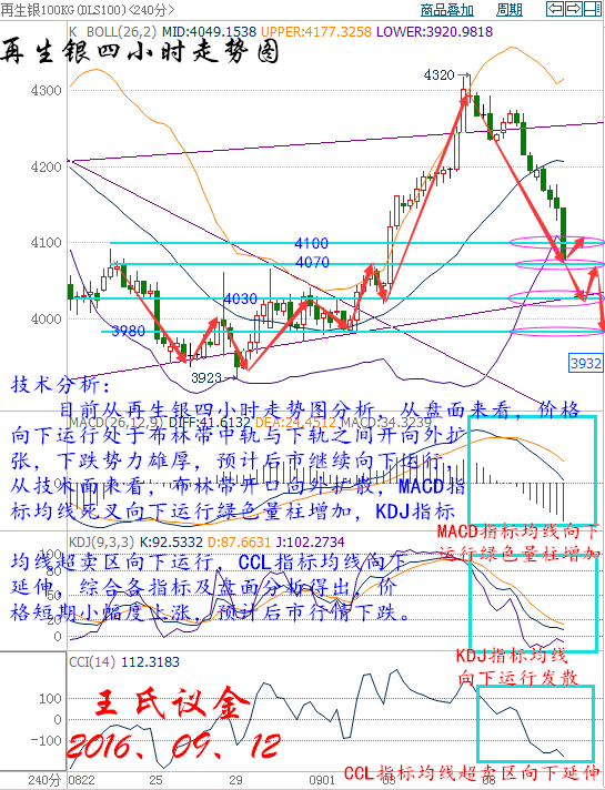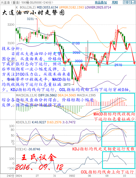 王氏寄語: 每天都是新的希望。行情起起落落有時你會認為無法預料,有一點要牢記:交易當中或許有許多失望,但一定不能絕望。每個人都是一個國王,在自己的世界里縱橫跋扈,習慣性的不愿聆聽別人的意見,你看不懂我的堅定,就別輕易指責我的分析!怕事后打了嘲笑背后你那藏在一邊的臉! 上周五收盤: 美國WTI原油10月期貨周五(9月9日)收跌1.74美元,或3.65%,報45.88美元/桶,本周上漲3.26%。布倫特原油11月期貨周五收跌1.98美元,或3.96%,報48.01美元/桶,本周上漲2.54%。雖然凍產押注依然為油價提供支撐,但原油庫存大降的支撐效果開始消退,因市場認為颶風影響不會持續,同時美元反彈以及美國石油活躍鉆井數的再度大增也令油價承壓。美國WTI原油期貨價格盤中最低觸及45.84美元/桶,布倫特原油期貨價格盤中最低觸及47.95美元/桶。 基本面利空因素: 波士頓聯儲主席羅森格倫周五表示,一直不愿加息的美聯儲如果等待太久才行動,那么其將面臨越來越大的風險,所以逐漸收緊政策或許是恰當的。羅森格倫歷來是美聯儲的一位鴿派官員,他意外發表鷹派言論后,金融市場掀起巨瀾。美元指數短線急漲至三個交易日高位95.56。美元走強令油價承壓。 美國油服公司貝克休斯(Baker Hughes)周五(9月9日)公布數據顯示,截至2016年9月9日當周美國石油活躍鉆井數增加7座至414座,過去11周內第10周錄得增加。同時美國石油和天然氣活躍鉆井總數增加11座至508座,較去年同期減少340座。 美國能源信息署(EIA)發布短期能源報告稱,2016年和2017年的美國原油產量降幅將小于預期,因擔心美國原油企業鉆井活動增加將幫助產量回升。在報告中,EIA上調2016年美國原油產量預估上調至877萬桶/日,預估降幅縮小至65萬桶/日,同時上調2017年美國原油產量預估至851萬桶/日,預估降幅縮小至26萬桶/日。 據彭博匯總的數據顯示,就在OPEC準備于本月晚些時候舉行非正式會談之際,來自該組織的日供應量8月增加12萬桶,達到3369萬桶創下歷史新高,其中從沙特阿拉伯到科威特等成員國紛紛提高產量。阿聯酋8月產量首次觸及300萬桶/日,伊拉克和科威特的產量也較7月小幅上漲。盡管此前包括沙特和伊拉克在內的產油國均表示會支持凍產,但兩國8月產量續增令人懷疑OPEC的凍產是否可信。 伊朗副油長莫扎密表示,該國當前原油產量為380萬桶/日,目標是在年底前增產至400萬桶/日;伊朗或在年底前與投資者簽署2-3個原油合同,目前在建的9個煉油廠中,最大的產能為36萬桶/日。伊朗此前稱只有油市份額恢復至制裁前水平才會參與凍產。 大交所現貨原油技術分析: 技術分析: 目前從大連油四小時走勢圖分析,從盤面來看,價格向下成擴張形態向下運行,預計后市短期有一波小幅度反彈,上方關注3100壓力位。從技術面來看,布林帶開口收攏走平,MACD指標均線收攏向下運行紅色量柱減少,KDJ指標均線向下運行,CCL指標均線由上向下運行穿破0軸,綜合各指標及盤面分析得出,價格短期小幅度反彈,預計后市行情繼續下跌。 操作建議: 今日大連油(美原油)整體操作趨勢以逢高做空為主,以低多為輔。(美原油兌大連油點位:約66.87) 日內阻力:3100/3160(46.36/47.26) 日內支撐:3020/2970(45.16/44.42) 激進者空單3100-3110區間內可以考慮擇機入場做空,止損3140上方,目標3060/3020。 激進者空單46.36-46.51區間內可以考慮擇機入場做空,止損46.96上方,目標45.76/45.16。 穩健者空單3160-3170區間內可以考慮擇機入場做空,止損3200上方,目標3130/3100。 穩健者空單47.26-47.41區間內可以考慮擇機入場做空,止損47.85上方,目標46.81/46.35。 激進者多單3060-3050區間內可以考慮擇機入場做多,止損3020下方,目標3100/3130。 激進者多單45.76-45.61區間內可以考慮擇機入場做多,止損45.16下方,目標46.36/46.81。 穩健者多單2970-2980區間內可以考慮擇機入場做多,止損2940下方,目標3000/3020。 穩健者多單44.42-44.56區間內可以考慮擇機入場做多,止損43.97下方,目標44.86/45.16。 以上操作建議僅供參考、投資有風險、操作需謹慎。 【以上建議出自中匯天融分析部,以實盤操作建議為準】 大交所現貨白銀技術分析: 技術分析: 目前從再生銀四小時走勢圖分析,從盤面來看,價格向下運行處于布林帶中軌與下軌之間開向外擴張,下跌勢力雄厚,預計后市繼續向下運行,從技術面來看,布林帶開口向外擴散,MACD指標均線死叉向下運行綠色量柱增加,KDJ指標均線超賣區向下運行,CCL指標均線向下延伸,綜合各指標及盤面分析得出,價格短期小幅度上漲,預計后市行情下跌。 操作建議: 今日再生銀(現貨白銀)整體操作趨勢以逢高做空為主,以低多為輔。(現貨白銀兌再生銀點位:約213.85) 日內阻力:4120/4160(19.27/19.45) 日內支撐:4040/3990(18.89/18.66) 激進者空單4070-4080區間內可以考慮擇機入場做空,止損4110上方,目標4040/4000。 激進者空單19.03-19.08區間內可以考慮擇機入場做空,止損19.22上方,目標18.89/18.7。 穩健者空單4110-4120區間內可以考慮擇機入場做空,止損4150上方,目標4050/4000。 穩健者空單19.22-19.27區間內可以考慮擇機入場做空,止損19.41上方,目標18.94/18.7。 激進者多單4030-4020區間內可以考慮擇機入場做多,止損3990下方,目標4050/4070。 激進者多單18.84-18.8區間內可以考慮擇機入場做多,止損18.66下方,目標18.94/19。 穩健者多單3990-3980區間內可以考慮擇機入場做多,止損3950下方,目標4030-4060。 穩健者多單18.66-18.61區間內可以考慮擇機入場做多,止損18.47