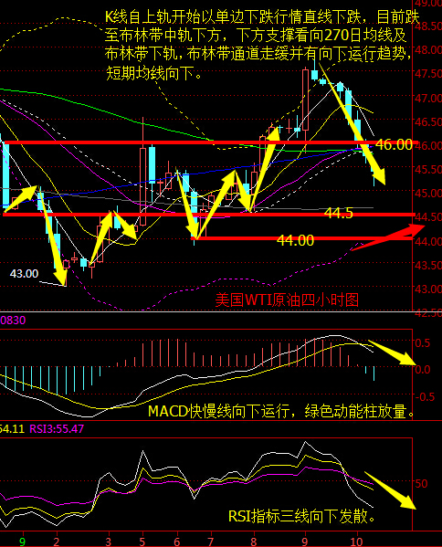 基本面分析: 周一(9月12日)亞市開盤,油價直接低開并大幅走低,最低在觸及45.08美元/桶后反彈,目前跌幅超過1%,最新報45.39美元/桶。 上周五(9月9日)美國WTI原油10月期貨收跌1.74美元,或3.65%,報45.88美元/桶,盤中最低觸及45.84美元/桶。布倫特原油11月期貨周五收跌1.98美元,或3.96%,報48.01美元/桶,盤中最低觸及47.95美元/桶。 據(jù)貝克休斯最新公布的石油鉆井數(shù)據(jù)顯示,截至2016年9月9日當周美國石油活躍鉆井數(shù)增加7座至414座,過去11周內(nèi)第10周錄得增加。同時美國石油和天然氣活躍鉆井總數(shù)增加11座至508座,較去年同期減少340座。 另外,波士頓聯(lián)儲主席羅森格倫上周五表示,一直不愿加息的美聯(lián)儲如果等待太久才行動,那么其將面臨越來越大的風險,所以逐漸收緊政策或許是恰當?shù)。在他發(fā)表講話后,美元指數(shù)短線急漲至三個交易日高位95.56。美元走強令油價承壓。 與此同時,據(jù)彭博最新的調(diào)查顯示,分析師及交易員連續(xù)第五周看空本周油價走勢。本周,原油市場又將迎來新一次的沖擊,重磅內(nèi)容包括:OPEC月報,IEA月報,及每周的EIA/API原油庫存數(shù)據(jù)。 技術面分析: 美國WTI原油從四小時走勢圖來看,K線自布林帶上軌開始以單邊下跌行情直線下跌,目前跌至布林帶中軌下方,下方支撐看向270均線及布林帶下軌,布林帶通道走緩并有向下運行趨勢,短期均線向下。 附圖MACD指標快慢線向下運行,綠色動能柱放量;RSI指標三線向下發(fā)散。 綜合來看,油價下跌動能較足,預計亞盤時段將繼續(xù)震蕩走低,若反彈,上方壓力則看向46美元位置。操作上建議以高位做空為主。 9.12美原油操作策略:高空為主。 46美元下方位置做空,目標看向45美元附近,止損在46.4美元附近; 44.5美元做多,目標看向45美元上方,小止損0.2美元。 現(xiàn)貨白銀從四小時走勢圖來看,目前K線價格跌穿布林帶下軌有修復需求,布林帶通道大幅度的開口,下軌向下運行,5、10日均線形成死叉向下貫穿22日均線,下方支撐看向18.8~18.6美元。 附圖MACD指標快慢線高位死叉向下發(fā)散,綠色動能柱充分放量;KD指標向下運行,目前KD值與黃金一樣均小于20,已處于超買區(qū)間。 綜合來看,短期內(nèi)白銀價格下跌勢頭較足,日內(nèi)操作上建議高位做空為主,鑒于KD指標處于超賣區(qū)間,可以在下方支撐區(qū)間嘗試性的抄底。 現(xiàn)貨白銀操作建議: 19美元附近做空,目標看向18.8美元下方,止損在19.1美元附近; 18.6美元附近嘗試抄底做多,目標看向19.2美元附近,止損在18.55美元 今日重點關注數(shù)據(jù): 18-20點歐佩克公布月度原油市場報告 (以上文章由春雨原創(chuàng),轉載請注明出處。溫馨提示,投資有風險,入市需謹慎。以上僅代表春雨個人觀點,不作操作依據(jù),據(jù)此操作風險自擔) |