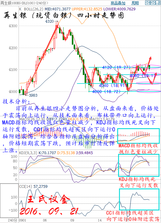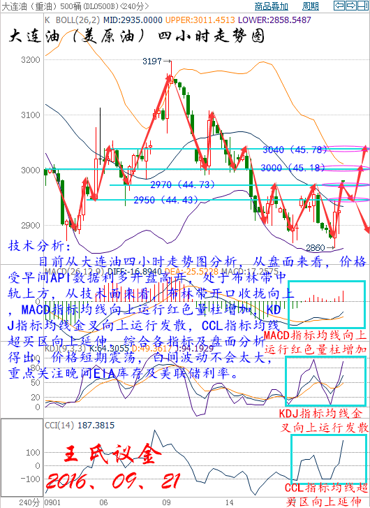 王氏議金: 總想寫一句引人注目的話,可總是寫出了感動自己的詞。試著博出意外的單邊,卻時常碰到無力震蕩的延續。坐在電腦前,數著波浪、盯著K線,深夜的寂靜、早間的陽光似乎都在重復的感受著,卻從來不覺得單調和乏味,行情的波動永遠都是倒退不了已經明了的昨天,一直期待憧憬未知的右側和明天。 昨日收盤: 美國WTI原油10月期貨周二(9月20日)收漲0.14美元,或0.32%,報43.44美元/桶。布倫特原油11月期貨周二收跌0.07美元,或0.15%,報45.88美元/桶。委內瑞拉油長的樂觀言論暫時為油價提供支撐,但基本面情況依然薄弱,尤其是美國原油庫存壓力正在不斷加大,美元多頭則在政策會議前保持謹慎。美國WTI原油期貨價格盤中最高觸及44.38美元/桶,布倫特原油期貨價格盤中最高觸及46.30美元/桶。 基本面利好因素: 委內瑞拉油長皮諾表示,石油輸出國組織(OPEC)與非OPEC產油國接近達成產量協議,正致力于在伊朗與沙特之間達成一致立場,而俄羅斯或將考慮支持協議。俄羅斯RIA新聞社援引OPEC秘書長巴爾金都(Mohammed Barkindo)講話稱,主要產油商之間可能達成的凍產協議將維持一年,較預期更長。之前沙特和俄羅斯曾在G20峰會期間達成合作協議,愿意共同穩定原油市場,這令原油多頭大受鼓舞。 美國能源信息署(EIA)數據顯示,截至9月9日當周美國原油庫存減少55.9萬桶,市場預估為增加380.0萬桶,錄得連續三周錄得下滑。美國原油交割地庫欣庫存減少124.5萬桶。庫欣地區原油庫存連續三周錄得下滑,降幅創12周最大。 中國統計局數據顯示,中國8月原油產量為1645萬噸,約合387萬桶/日,較去年同期下降9.9%,日均產量觸及至少2009年12月以來最低水平,同時也為同期第二大單月降幅。低油價迫使國有油企逐漸關閉運營成本高昂的油田,更多依賴進口補充原油供應。中國8月共進口3285萬噸原油,約777萬桶/日,為4月來最高。這些有助于緩解原油市場的供應過剩問題。 俄羅斯能源部公布的數據顯示,今年8月俄羅斯原油、凝析油產量為4531萬噸,或1071萬桶/日,同比上漲0.1%,但環比下滑1.6%。數據還顯示,俄羅斯8月原油出口為499萬桶/日,環比下滑5.67%,同比下滑0.6%。今年1月俄羅斯的原油產量曾觸及1091萬桶/日,創下蘇聯解體后的歷史高位。俄羅斯總統普京(Vladimir Putin)在接受采訪時稱,他希望產油國能達成原油凍產協議,凍產對于全球油市將是個正確的決定。同時,他還認為凍產協議中可能要在伊朗產量方面作出讓步。 美原油技術分析: 技術分析: 目前從大連油四小時走勢圖分析,從盤面來看,價格受早間API數據利多開盤高開,處于布林帶中軌上方,從技術面來看,布林帶開口收攏向上,MACD指標均線向上運行紅色量柱增加,KDJ指標均線金叉向上運行發散,CCL指標均線超買區向上延伸,綜合各指標及盤面分析得出,價格短期震蕩,白間波動不會太大,重點關注晚間EIA庫存及美聯儲利率。 操作建議: 今日大連油整體操作趨勢以逢低做多為主,以高空為輔。 日內阻力:2970/3030 日內支撐:2900/2860 激進者空單2980-2970區間內可以考慮擇機入場做空,止損3000上方,目標2950/2920。 穩健者空單3030-3020區間內可以考慮擇機入場做空,止損3060上方,目標2980/2950 激進者多單2950-2940區間內可以考慮擇機入場做多,止損2910下方,目標3000/3030。 穩健者多單2900-2910區間內可以考慮擇機入場做多,止損2870下方,目標2950/2980。 美原油兌大連油點位:約66.4 美原油操作建議: 今日美原油整體操作趨勢以逢低做多為主,以高空為輔。 日內阻力:44.72/45.63 日內支撐:43.67/43.07 激進者空單44.88-44.73區間內可以考慮擇機入場做空,止損45.18上方,目標44.42/43.98。 穩健者空單45.63-45.48區間內可以考慮擇機入場做空,止損46.08上方,目標44.88/44.43。 激進者多單44.43-44.28區間內可以考慮擇機入場做多,止損43.83下方,目標45.18/45.63。 穩健者多單43.67-43.83區間內可以考慮擇機入場做多,止損43.22下方,目標44.43/44.88。 以上操作建議僅供參考、投資有風險、操作需謹慎。 【以上建議出自中匯天融分析部,以實盤操作建議為準】 現貨白銀技術分析: 技術分析: 目前從再生銀四小走勢圖分析,從盤面來看,價格處于震蕩向上運行,從技術面來看,布林帶開口向上運行,MACD指標均線收攏紅色量柱減少,KDJ指標均線死叉向下運行發散,CCI指標均線超買區向下運行0軸附近震蕩,綜合各指標及盤面分析得出,價格短期震蕩下跌,預計后市行情反彈上漲。 操作建議: 今日再生銀整體操作趨勢以逢低做多為主,以高空為輔。 日內阻力:4160/4200 日內支撐:4080/4030 激進者空單4130-4140區間內可以考慮擇機入場做空,止損4170上方,目標4100/4070。 穩健者空單4170-4180區間內可以考慮擇機入場做空,止損4210上方,目標4140/4100。 激進者多單4100-4090區間內可以考慮擇機入場做多,止損4060下方,目標4130/4160。 穩健者多單4070-4060區間內可以考慮擇機入場做多,止損4030下方,目標4100/4130。 現貨白銀兌再生銀點位:約213.7 現貨白銀操作建議: 今日現貨白銀整體操作趨勢以逢低做多為主,以高空為輔。 日內阻力:19.47/19.65 日內支撐:19.1/18.86 激進者空單19.33-19.37區間內可以考慮擇機入場做空,止損19.51上方,目標19.19/19.05。 穩健者空單19.51-19.56區間內可以考慮擇機入場做空,止損19.7上方,目標19.37/19.19。 激進者多單19.19-19.14區間內可以考慮擇機入場做多,止損19下方,目標19.33/19.47。 穩健者多單19.05-19區間內可以考慮擇機入場做多,止損18.86下方,目標19.