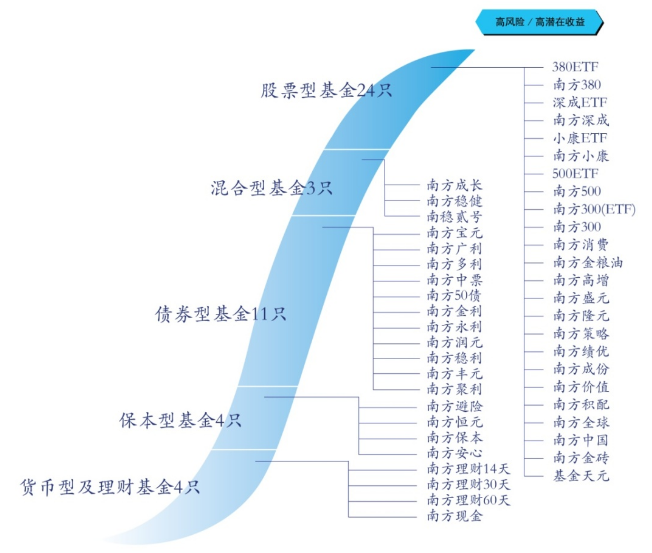 1998年3月6日,經中國證監會批準,南方基金管理有限公司作為國內首批規范的基金管理公司正式成立,成為我國“新基金時代”的起始標志。 公司經歷了中國證券市場多次牛熊交替的長期考驗,以持續優秀的投資業績、完善周到的客戶服務,贏得了廣大基金投資人、社保理事會、企業年金客戶、專戶客戶的認可和信賴。截至2013年末,公司管理資產規模2263億元,位居行業前列。旗下管理公募基金共46只,其中開放式基金45只、封閉式基金1只,產品涵蓋股票型、混合型、債券型、保本型、貨幣型、指數型、QDII等。公募基金資產管理規模1520億元,累計向基金持有人分紅超過522億元,擁有客戶數量突破1400萬人。私募業務管理規模743億元,在行業中持續保持領先地位。南方基金已經發展成為國內產品種類最豐富、業務領域最全面、經營業績優秀、資產管理規模最大的基金管理公司之一。