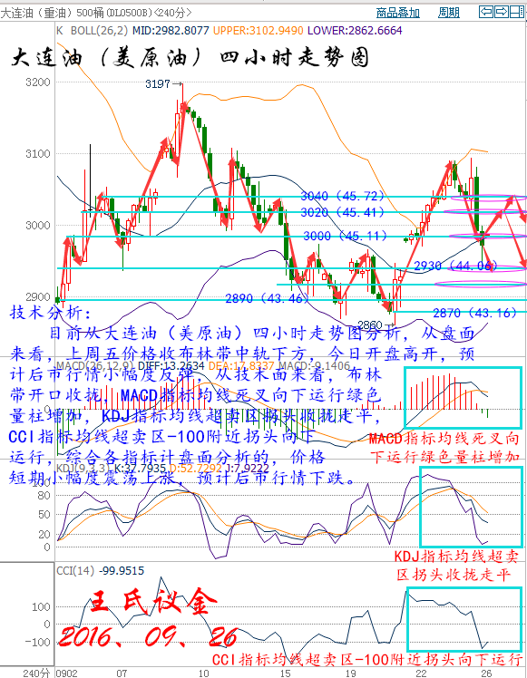 | 王氏寄語: 知識是抵御一切災禍的盾牌。任何人的知識不可能超過他自己的經驗,但是所有的經驗都需要用知識表達和傳遞。就好比一切的數據被技術包含,所有的技術反應一切的消息,互相牽制又相互影響,缺一不可。 上周五收盤: 美國WTI原油11月期貨周五(9月23日)收跌1.84美元,或3.97%,報44.48美元/桶,本周上漲2.75%。布倫特原油11月期貨周五收跌1.76美元,或3.69%,報45.89美元/桶,本周上漲2.27%。近期沙特對凍產協議的態度飄忽不定,今日表示下周會談恐無法達成協議,令投資情緒大受打擊,同時美國石油活躍鉆井數繼續攀升令油價承壓重挫 。美國WTI原油期貨價格盤中最低觸及44.23美元/桶,布倫特原油期貨價格盤中最低觸及45.66美元/桶。 基本面利好因素: 美國周五公布的一份行業報告顯示,美國9月制造業采購經理人指數(PMI)初值低于預估,且低于上月終值。明尼亞波利斯聯儲主席卡什卡利表示,相信勞動力市場仍有松弛存在,美國長期潛在經濟增速略低于2%。相比加息太慢,更擔心加息太快。日內數位美聯儲委員的講話整體偏向鴿派,美元指數繼續低迷交投,這在一定程度上限制了油價的下行空間。 美國能源信息署(EIA)數據顯示,截至9月16日當周美國原油庫存減少620萬桶,市場預估為增加335萬桶,連續三周錄得下滑。美國上周汽油庫存減少320.4萬桶,市場預估為減少56.7萬桶。美國原油交割地庫欣庫存減少124.5萬桶。庫欣地區原油庫存連續三周錄得下滑,降幅創12周最大。 中國統計局數據顯示,中國8月原油產量為1645萬噸,約合387萬桶/日,較去年同期下降9.9%,日均產量觸及至少2009年12月以來最低水平,同時也為同期第二大單月降幅。低油價迫使國有油企逐漸關閉運營成本高昂的油田,更多依賴進口補充原油供應。中國8月共進口3285萬噸原油,約777萬桶/日,為4月來最高。這些有助于緩解原油市場的供應過剩問題。 基本面利空因素: 三位知情消息人士稱,在下周阿爾及利亞產油國會議之前,沙特阿拉伯已經提出一項重大讓步,如果伊朗同意對其今年產量設限,沙特愿意降低自己的石油產量。不過隨后沙特方面表示,預期下周的產油國會談上不會達成凍產協議,這令多頭大失所望。 美國油服公司貝克休斯(Baker Hughes)周五(9月23日)公布數據顯示,截至2016年9月23日當周美國石油活躍鉆井數再增2座至418座,過去13周內第12周錄得增加。截至9月23日當周美國石油和天然氣活躍鉆井總數增加5座至511座,較去年同期減少327座。 能源情報監測機構Genscape今日數據顯示,截至9月20日一周,美國原油主要交割地庫欣地區庫存增加21.3萬桶。庫欣庫存一直是美國原油庫存的重要組成部分,Genscape報告表明,在截至9月16日一周庫欣庫存增加52.6萬桶后該地區庫存繼續攀升,或暗示美國原油庫存將再度回升。 俄羅斯能源部信息顯示,截至9月20日俄羅斯本月原油產量達到1109萬桶/日,9月上旬該國原油產量更是一度觸及歷史新高1175萬桶/日。預計俄羅斯原油產量年內將觸及547萬噸,約合1095萬桶/日,高于2015年的534萬噸紀錄水平,約合1072萬桶/日。同時 俄羅斯總統普京周三宣布新油田正式投產,今年將為俄羅斯增加60萬噸的原油產量,約合1.2萬桶/日。利比亞預期在本周開始重啟Ras Lanuf港口的原油出口,為至少2014年以來首次。此外,尼日利亞Forcados將在9月底之前恢復原油運輸,為2月以來首次。 美國能源信息署(EIA)數據顯示,截至9月16日當周原油交割地庫欣庫存增加52.6萬桶,結束連續三周的下滑趨勢。美國精煉油庫存增加223.8萬桶,市場預估為增加25.0萬桶,為連續六周錄得增加。上周美國原油日進口量增加7.7萬桶,煉廠產能利用率下降0.9個百分點,日煉油量減少14.3萬桶。此外,上周美國國內原油產量增加1.9萬桶至851.2萬桶/日。 美原油技術分析: 技術分析: 目前從大連油(美原油)四小時走勢圖分析,從盤面來看,上周五價格收布林帶中軌下方,今日開盤高開,預計后市行情小幅度反彈,從技術面來看,布林帶開口收攏,MACD指標均線死叉向下運行綠色量柱增加,KDJ指標均線超賣區拐頭收攏走平,CCI指標均線超賣區-100附近拐頭向下運行,綜合各指標計盤面分析的,價格短期小幅度震蕩上漲,預計后市行情下跌。 操作建議: 大連油操作建議 今日大連油整體操作趨勢以逢高做空為主,以低多為輔。 日內阻力:3040/3070 日內支撐:2970/2940 激進者空單3000-2990區間內可以考慮擇機入場做空,止損3040上方,目標2970/2940。 穩健者空單3040-3030區間內可以考慮擇機入場做空,止損3070上方,目標3000/2970。 激進者多單2950-2960區間內可以考慮擇機入場做多,止損2920下方,目標3000/3040。 穩健者多單2920-2930區間內可以考慮擇機入場做多,止損2890下方,目標2960/2990。 美原油操作建議: 今日美原油整體操作趨勢以逢高做空為主,以低多為輔。 日內阻力:45.71/46.17 日內支撐:44.66/44.21 激進者空單45.11-44.96區間內可以考慮擇機入場做空,止損45.71上方,目標44.66/44.21。 穩健者空單45.71-45.56區間內可以考慮擇機入場做空,止損46.17上方,目標45.11/44.66。 激進者多單44.36-44.51區間內可以考慮擇機入場做多,止損43.9下方,目標45.11/45.71。 穩健者多單43.9-44.06區間內可以考慮擇機入場做多,止損43.46下方,目標44.51/44.96。 以上操作建議僅供參考、投資有風險、操作需謹慎。 【以上建議出自中匯天融分析部,以實盤操作建議為準】 現貨白銀技術分析: 技術分析: 目前從再生銀(現貨白銀)四小時走勢圖分