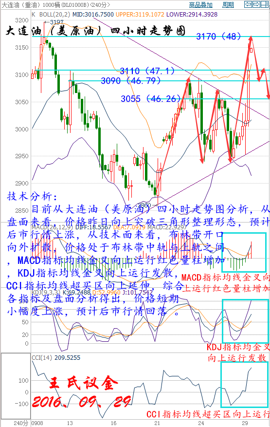 (原標題:王氏議金:9.29現貨原油、白銀、瀝青、天然氣分析操作建議,凍產協議達成不穩) 王氏寄語: 交易中每一次出手就像在山谷當中的喊聲,你沒有必要期望要誰知道,但那回音就是市場對你最好的回報,聽自己內心最真的聲音,做自己明白卻了解的行情。過程和結局都有了、再去糾纏、連你自己有時候都覺得貪婪,承諾并非全球統一價,有的一文不值,而我的卻永遠一諾千金。 美國WTI原油11月期貨周三(9月28日)收漲2.38美元,或5.33%,報47.05美元/桶。布倫特原油11月期貨周三收漲2.72美元,或5.92%,報48.69美元/桶。石油輸出國組織(OPEC)意外達成凍產協議,為8年以來首次達成凍產協議,消息傳出后,原油市場大受提振。美國WTI原油期貨價格盤中最高觸及47.43美元/桶,布倫特原油期貨價格盤中最高觸及49.49美元/桶。 國際現貨原油消息面———— OPEC成員國在阿爾及爾達成凍產協議以限制原油供應,為8年以來首次達成凍產協議。OPEC同意將石油產量限制在3250-3300萬桶/日區間。一位消息人士稱,一旦該組織達到其目標,OPEC將向非OPEC產油國尋求支持。此外,OPEC將在11月的下次正式會議上對各成員國的具體產量水準達成協議。 美聯儲主席耶倫周三在眾議院金融服務委員會就銀行監管作證詞稱,并未為加息設定固定時間表,將在當前路徑上逐步去除寬松政策。耶倫講話期間,美元指數短線急漲并刷新日高至95.74。但隨著OPEC消息人士表示達成限產協議后,美元兌澳元、紐元、挪威克朗、加元等仰仗能源或原材料出口的國家的貨幣全面下滑,美元指數也盡數回吐日內漲幅轉而下行,這為油價提供了一定支撐。 美國能源信息署(EIA)數據顯示,截至9月23日當周美國原油庫存減少190萬桶,市場預估為增加300萬桶,連續四周錄得下滑。美國精煉油庫存減少190萬桶,市場預估為減少1.4萬桶,為8周來首次錄得下滑。此外,美國原油交割地庫欣庫存減少63.1萬桶。 中國統計局數據顯示,中國8月原油產量為1645萬噸,約合387萬桶/日,較去年同期下降9.9%,日均產量觸及至少2009年12月以來最低水平,同時也為同期第二大單月降幅。低油價迫使國有油企逐漸關閉運營成本高昂的油田,更多依賴進口補充原油供應。中國8月共進口3285萬噸原油,約777萬桶/日,為4月來最高。這些有助于緩解原油市場的供應過剩問題。 現貨原油技術分析及操作建議---------- 技術分析: 目前從大連油(美原油)四小時走勢圖分析,從盤面來看,價格昨日向上突破三角形整理形態,預計后市行情上漲,從技術面來看,布林帶開口向外擴散,價格處于布林帶中軌與上軌之間,MACD指標均線金叉向上運行紅色量柱增加,KDJ指標均線金叉向上運行發散,CCI指標均線超買區向上延伸,綜合各指標及盤面分析得出,價格短期小幅度上漲,預計后市行情回落 。 大連油操作建議 今日大連油整體操作趨勢以逢高做空為主,以低多為輔。 日內阻力:3150/3190 日內支撐:3070/3010 激進者空單3150-3160區間內可以考慮擇機入場做空,止損3190上方,目標3100/3060。 穩健者空單3190-3200區間內可以考慮擇機入場做空,止損3230上方,目標3150/3110。 激進者多單3100-3110區間內可以考慮擇機入場做多,止損3070下方,目標3150/3190。 穩健者多單3050-3060區間內可以考慮擇機入場做多,止損3020下方,目標3090/3120。 美原油操作建議: 今日美原油整體操作趨勢以逢高做空為主,以低多為輔。 日內阻力:47.7/48.3 日內支撐:46.49/45.58 激進者空單47.7-47.85區間內可以考慮擇機入場做空,止損48.3上方,目標46.94/46.34。 穩健者空單48.3-48.46區間內可以考慮擇機入場做空,止損48.91上方,目標47.69/47.09。 激進者多單46.94-47.09區間內可以考慮擇機入場做多,止損46.49下方,目標47.7/48.3。 穩健者多單46.18-46.34區間內可以考慮擇機入場做多,止損45.73下方,目標46.79/47.24。 以上操作建議僅供參考、投資有風險、操作需謹慎。 【以上建議出自中匯天融分析部,以實盤操作建議為準】 現貨白銀技術分析及操作建議-------- 技術分析: 目前從再生銀四小時走勢圖分析,從盤面分析,價格處于底部反彈,下方支撐不破,后市看多,從技術面來看,布林帶開口拐頭收攏,MACD指標均線收攏綠色量柱減少,KDJ指標均線金叉向上運行發散,CCI指標均線0軸由下向上突破向上運行,綜合各指標及盤面分析得出,價格短期小幅度回落,預計后市行情上漲。 再生銀操作建議: 今日再生銀整體操作趨勢以逢低做多為主,以高空為輔。 日內阻力:4150/4200 日內支撐:4070/4010 激進者空單4150-4140區間內可以考慮擇機入場做空,止損4180上方,目標4100/4070。 穩健者空單4170-4180區間內可以考慮擇機入場做空,止損4210上方,目標4100/4070。 激進者多單4100-4110區間內可以考慮擇機入場做多,止損4070下方,目標4160/4200。 穩健者多單4020-4010區間內可以考慮擇機入場做多,止損3980下方,目標4070/4100。 現貨白銀操作建議: 今日現貨白銀整體操作趨勢以逢低做多為主,以高空為輔。 日內阻力:19.32/19.55 日內支撐:18.95/18.67 激進者空單19.32-19.27區間內可以考慮擇機入場做空,止損19.46上方,目標19.09/18.95。 穩健者空單19.41-19.13區間內可以考慮擇機入場做空,止損19.6上方,目標19.09/18.95。 激進者多單19.09-19.13區間內可以考慮擇機入場做多,止損18.95下方,目標19.37/19.55。 穩健者多單18.72-18.67區間內可以考慮擇機入場做多,止損18.53下方,目標18.95/19.09。 以上操作建議僅供參考、投資有風險、操作需謹慎。 【以上建議出自中匯天