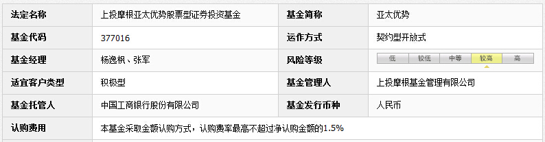基金投資選擇是一件很費力的事情,不少投資者會資訊一些有經(jīng)驗的大牛,或者通過他們發(fā)布的研究文章來選擇,雖然是一個好辦法,但是很多時候個人的觀點和經(jīng)驗僅僅是從他自身的角度來出發(fā),并不能代表你的投資偏好。小編覺得對所投基金有個全面的了解才能做出正確的選擇。下面就一起來了解這只上投摩根亞太優(yōu)勢基金的當該概況吧。 一、上投摩根亞太優(yōu)勢基金檔案表根據(jù)上投摩根亞太優(yōu)勢基金的一些基本特點,小編整理了一下基金檔案表,通此表你將對此基金有個全面的認識: