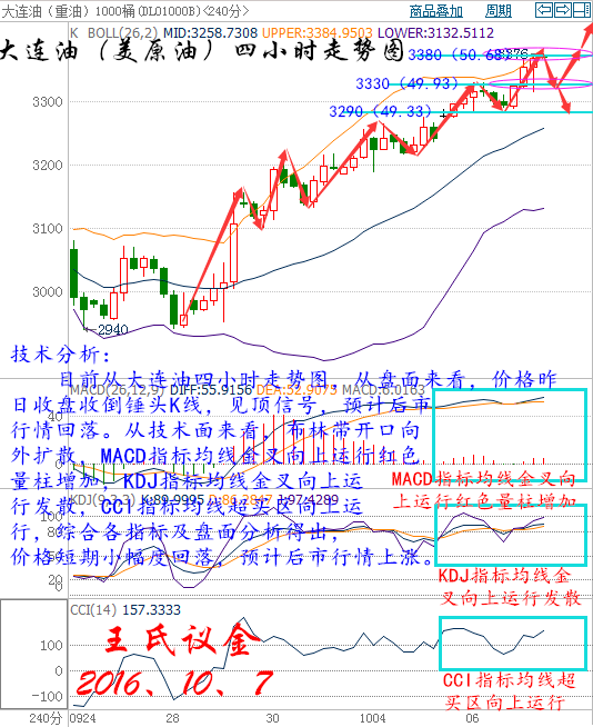 (原標題:王氏議金:10.7現貨原油、白銀、瀝青及天然氣操作建議,50美元告急!) 王氏寄語: 如果我們互相不信任,這個世界跟地獄又有什么區別?當你發現在市場中再也沒有什么可以失去的時候,就是你開始得到的時候。有所得是低級快樂,有所求是高級快樂。 昨日收盤: 油價周四(10月6日)上揚逾1%至四個月高位,其中美國原油期貨收復50美元/桶關口,為6月24日英國脫歐公投以來首次升至這一水平上方。上一個交易日,美國原油庫存水平以驚人的速度下滑,從而支撐了油價上漲。此外,油價也受到石油輸出國組織(OPEC)將再次進行非正式會議,討論減產所支撐。NYMEX原油周四收盤上漲0.61美元,或1.22%,報50.44美元/桶;布倫特原油周四收盤上漲0.65美元,或1.25%,報52.51美元/桶。不過,有分析師指出原油庫存仍然接近紀錄高位,甚至世界最大出口商適度削減生產前景可能都不足以刺激油價持續的反彈。部分人士認為,市場在過去七日上漲近15%的漲勢過度。 基本面利好因素: OPEC消息人士稱,沙特、伊朗和伊拉克能源部長等主要OPEC產油國的代表,將于下周伊斯坦布爾舉行的能源行業大會的間歇與非OPEC產油國俄羅斯開會。OPEC于9月28日在阿爾及爾舉行的非正式會議上宣布希望將日產量減少至3,250-3,300萬桶后,油價已累積攀升6美元。減產計劃將導致每日供應減少約70萬桶,分析師估計,目前全球供應過剩100-150萬桶/日。 美國能源信息署(EIA)數據顯示,截至9月30日當周美國原油庫存減少297.6萬桶,市場預估為增加150萬桶,連續五周錄得下滑。美國精煉油庫存精煉油庫存連續兩周下滑,降幅創四個月以來最大。此外,美國原油進口下滑1.6%至771萬桶每日,產量下降0.4%至847萬桶美日。 OPEC成員國在阿爾及爾達成凍產協議以限制原油供應,為8年以來首次達成凍產協議。OPEC同意將石油產量限制在3250-3300萬桶/日區間。一位消息人士稱,一旦該組織達到其目標,OPEC將向非OPEC產油國尋求支持。此外,OPEC將在11月的下次正式會議上對各成員國的具體產量水準達成協議。 中國統計局數據顯示,中國8月原油產量為1645萬噸,約合387萬桶/日,較去年同期下降9.9%,日均產量觸及至少2009年12月以來最低水平,同時也為同期第二大單月降幅。低油價迫使國有油企逐漸關閉運營成本高昂的油田,更多依賴進口補充原油供應。中國8月共進口3285萬噸原油,約777萬桶/日,為4月來最高。這些有助于緩解原油市場的供應過剩問題。 現貨原油技術分析及操作建議---------- 技術分析: 目前從大連油四小時走勢圖分析,從盤面來看,價格昨日收盤收倒錘頭K線,見頂信號,預計后市行情回落。從技術面來看,布林帶開口向外擴散,MACD指標均線金叉向上運行紅色量柱增加,KDJ指標均線金叉向上運行發散,CCI指標均線超買區向上運行,綜合各指標及盤面分析得出,價格短期小幅度回落,預計后市行情上漲。 大連油操作建議: 今日大連油整體趨勢以逢低做多為主,以高空為輔。 日內阻力:3420/3460 日內支撐:3320/3260 激進者空單3380-3390區間內可以考慮擇機入場做空,止損3420上方,目標3340/3300。 穩健者空單3420-3430區間內可以考慮擇機入場做空,止損3460上方,目標3380/3330。 激進者多單3350-3360區間內可以考慮擇機入場做多,止損3320下方,目標3410/3450。 穩健者多單3290-3300區間內可以考慮擇機入場做多,止損3260下方,目標3330/3380。 以上操作建議僅供參考、投資有風險、操作需謹慎。 【以上建議出自中匯天融分析部,以實盤操作建議為準】 美原油操作建議: 今日美原油整體趨勢以逢低做多為主,以高空為輔。 日內阻力 :51.28/51.88 日內支撐:49.78/48.88 激進者空單50.68-50.83區間內可以考慮擇機入場做空,止損51.28上方,目標50.08/49.48。 穩健者空單51.28-51.43區間內可以考慮擇機入場做空,止損51.88上方,目標50.68/49.93。 激進者多單50.23-50.38區間內可以考慮擇機入場做多,止損49.78下方,目標51.13-51.73。 穩健者多單49.33-49.48區間內可以考慮擇機入場做多,止損48.88下方,目標49.93/50.68。 以上操作建議僅供參考、投資有風險、操作需謹慎。 【以上建議出自中匯天融分析部,以實盤操作建議為準】 瀝青方面操作指導: 瀝青屬原油衍生品,行情走勢分析與原油走勢相同,因平臺不同點位各異,有做瀝青需要指導的朋友可以聯系本人。 天然氣技術分析及操作建議--------- 昨日晚間公布的天然氣EIA數據利空,天然氣短線下挫又迅速反彈,漲跌起伏較大,日圖最終收取一根下引線較長的小陽柱,繼連續三日收陽后,多頭力度有所削弱,但均線系統仍呈多頭排列,今日預計高位震蕩概率較大,目前均線粘合,但KDJ等有拐頭跡象,正在進一步選擇方向,若是突破前期高點可繼續追多,若是觸頂下跌可做短空,中線趨勢不變的情況下依舊還是看多。上方關注5200/5150兩點壓力位,下方關注5000/5060兩點支撐位。 天然氣操作策略: 1、首次回踩5030-5050輕倉做多,目標5100附近離場,止損35點; 2、反彈5130-5150區域做空,目標5060獲利離場,止損35點; 3、回踩4990-5010區域做多,目標5080減倉,見5110全部離場,止損4970下方;以上操作建議僅供參考、投資有風險、操作需謹慎。 【以上建議出自中匯天融分析部,以實盤操作建議為準】 現貨白銀技術分析及操作建議---------- 技術分析: 目前從再生銀(現貨白銀)四小時走勢圖分析,從盤面來看,價格昨日一路下跌,預計后市行情繼續回落.從技術面來看,布林帶開口向下運行,MACD指標均線走平收攏綠色量柱減