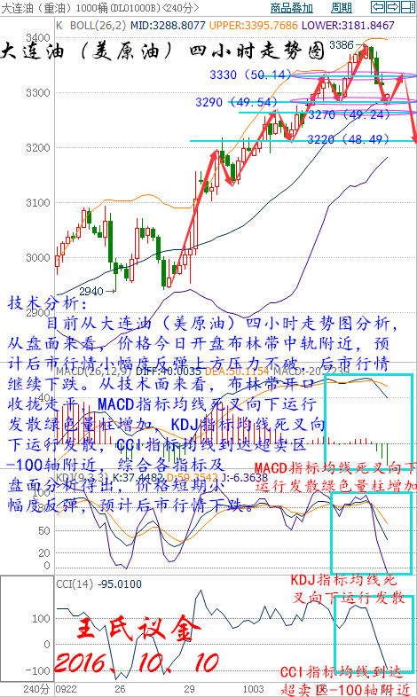 (原標題:王氏議金:10、10現貨原油、白銀、瀝青及天然氣操作建議!原油中長線布局(附加天然氣空單解套)) 王氏寄語: 如果我們互相不信任,這個世界跟地獄又有什么區別?當你發現在市場中再也沒有什么可以失去的時候,就是你開始得到的時候。有所得是低級快樂,有所求是高級快樂。 上周五收盤: 周五(10月7日),美國公布的石油鉆井數量高于預期,同時俄羅斯否認將于下周與OPEC達成任何減產協議,此前受到OPEC會議意外達成減產意向及美國石油儲量下跌提振的油價漲勢止步。 美國公布稱,至10月7日當周石油鉆井總數達428口,高于425口的前值和預期值,連續15周錄得增加,創下2016年2月以來的最高水平。 周四曾有OPEC消息人士表示,沙特、伊朗和伊拉克能源部長等主要OPEC產油國的代表,將于下周伊斯坦布爾舉行的能源行業大會的間歇與非OPEC產油國俄羅斯開會。但俄羅斯能源部長Alexander Novak在周五表示,他并不預期在下周于伊斯坦布爾舉行的世界能源大會上會與OPEC簽署協議。 在這兩大利空因素的影響下,布倫特原油期貨周四收跌0.58美元,跌幅1.10%,報51.93美元/桶。NYMEX原油期貨周四收跌0.63美元,跌幅1.25%,報49.81美元/桶。 基本面利空因素: 俄羅斯能源部周日數據顯示,俄羅斯9月原油產量較8月增長近4%至1111萬桶/日,創后蘇聯時期紀錄新高。俄羅斯9月原油產量達到4548.3萬噸,8月產量為4530.9萬噸,8月日均產量為1071萬桶。分析師認為如果限產協議要對油價產生實質性影響,類似于俄羅斯等非OPEC產油國的支持也是不可或缺的,因此俄羅斯原油產量再攀新高令油市供應過剩問題恐難得到改善。 路透調查數據顯示,9月OPEC原油產量環比料增7萬桶/日至3360萬桶/日的高位;其中伊拉克和利比亞增幅可能領先其他成員國,而沙特產量將為1055萬桶/日。伊拉克石油部長盧艾比(Jabar Ali al-Luaibi)在會后舉行了單獨的記者會,抱怨OPEC低估了伊拉克的石油產量。許多分析師認為,盧艾比的反抗表明OPEC將產量上限控制在每日3250-3300萬桶的決定脆弱不堪,且缺乏約束力。 現貨原油技術分析及操作建議---------- 技術分析: 目前從大連油(美原油)四小時走勢圖分析,從盤面來看,價格今日開盤布林帶中軌附近,預計后市行情小幅度反彈上方壓力不破,后市行情繼續下跌。從技術面來看,布林帶開口收攏走平,MACD指標均線死叉向下運行發散綠色量柱增加,KDJ指標均線死叉向下運行發散,CCI指標均線到達超賣區-100軸附近,綜合各指標及盤面分析得出,價格短期小幅度反彈,預計后市行情下跌。 大連油操作建議: 今日大連油(美原油)整體趨勢以逢高做空為主,以低多為輔。 日內阻力 :3330/3380 日內支撐:3280/3220 激進者空單3290~3300區間內可以考慮擇機入場做空,止損3330上方,目標3250/3220。 穩健者空單3330~3340區間內可以考慮擇機入場做空,止損3370上方,目標3290/3250。 激進者多單3290~3280區間內可以考慮擇機入場做多,止損3250下方,目標3330/3380。 穩健者多單3210~3220區間內可以考慮擇機入場做多,止損3180下方,目標3250/3270。 以上操作建議僅供參考、投資有風險、操作需謹慎。 【以上建議出自中匯天融分析部,以實盤操作建議為準】 美原油操作建議: 今日美原油整體趨勢以逢高做空為主,以低多為輔。 日內阻力 :50.14/50.9 日內支撐:49.39/48.49 激進者空單49.54~49.69區間內可以考慮擇機入場做空,止損50.14上方,目標48.94/48.49。 穩健者空單50.14~50.29區間內可以考慮擇機入場做空,止損50.75上方,目標49.54/48.94。 激進者多單49.54~49.39區間內可以考慮擇機入場做多,止損48.94下方,目標50.14/50.9。 穩健者多單48.34~48.49區間內可以考慮擇機入場做多,止損47.88下方,目標48.94/49.24。 以上操作建議僅供參考、投資有風險、操作需謹慎。 【以上建議出自中匯天融分析部,以實盤操作建議為準】 瀝青方面操作指導: 瀝青屬原油衍生品,行情走勢分析與原油走勢相同,因平臺不同點位各異,有做瀝青需要指導的朋友可以聯系本人。 天然氣技術分析: 天然氣,從日線圖來看,本周的五個交易日全部收陽形成了五連陽的局面,也使上圖的上行空間得到了完美注釋!但是,我們不難發現,每一次上漲之后必然會回調,昨晚天然氣價格暴漲300點之后,刷新了之前5709的高點,首次站在了5865高位,但是行情沒有永遠的上漲,也沒有永遠下跌,我們的目的是在每一波的回調或反彈中抓取到盈利的空間。目前天然氣價格已經處于價格通道頂部,即將出現回調。 天然氣為什么暴漲? 王氏議金分析:冬季加熱需求上升推動美國天然氣價格創21個月新高,因交易員對美國東南地區冬季加熱需求大增的預期,周五美國天然氣期貨合約價格大漲,創21個月高點,本周天然氣期貨已累計上漲10%;不過,颶風“馬修”沖擊佛羅里達州,導致該州超過80萬家庭及企業供電中斷,這意味著經由佛羅里達氣管輸送的天然氣或會下滑到一個月均值下方。 天然氣空單如何解套? 套了空單的朋友不要著急,行情已經到了上行通道的頂端,這個時候更是冷靜的時候,如果你的資金夠大,那么完全不需要擔心,周一開盤補空就好,目標就在5700附近;如果你現在的風險已經夠低,那么我勸你開盤觀望一下情況再說,有用得著王老師的地方,可以及時與王氏議金溝通! 現貨白銀技術分析及操作建議---------- 技術分析: 目前從再生銀(現貨白銀)四小時走勢圖,從盤面來看,價格在底部形成雙底,預計后市企穩上漲,從技術面來看,布林帶開口收