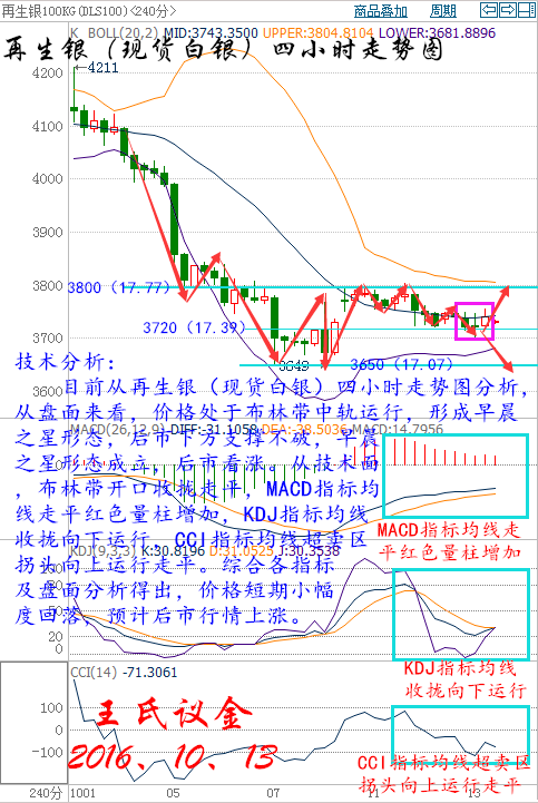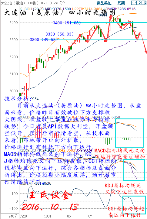 王氏寄語: 當明天變成了今天成為了昨天,最后成為記憶里不再重要的某一天,我突然發現自己在不知不覺中已被時間推著向前走,這不是靜止火車里,與相鄰列車交錯時,仿佛自己在前進的錯覺,而是你我真實的在經歷和成長,無論會變好還是變壞,你我已不再是昨天的自己,善待此時的自己只為不一樣的明天。 昨日收盤: 美國WTI原油11月期貨周三(10月12日)收跌0.61美元,或1.20%,報50.18美元/桶。布倫特原油12月期貨周三收跌0.60美元,或1.14%,報51.81美元/桶。雖然美聯儲9月會議紀要顯示內部分歧加大,但美聯儲12月加息概率依然較高,美元走強令油價承壓,此外,產油國磋商并未產生實質進展,這令原油多頭信心受挫。美國WTI原油期貨價格盤中最低觸及49.91美元/桶,布倫特原油期貨價格盤中最低觸及51.62美元/桶。 基本面利好因素: 國際能源署(IEA)月報稱,若石油輸出國組織(OPEC)和俄羅斯達成協議的減產幅度夠大,則全球油市可能加速恢復供需平衡,但在更多細節浮現之前,尚不清楚這個速度有多快。IEA在8月報告中稱,預計明年全球石油日需求增長120萬桶,與上月預估一致,但將2016年增幅預估從130萬桶下調至約120萬桶。 能源情報監測機構Genscape最新數據顯示,截至10月7日當周,美國原油主要交割地庫欣地區原油庫存減少38.3萬桶。 美國能源信息署(EIA)數據顯示,截至9月30日當周美國原油庫存減少297.6萬桶,市場預估為增加150萬桶,連續五周錄得下滑。美國精煉油庫存連續兩周下滑,降幅創四個月以來最大。此外,美國原油進口下滑1.6%至771萬桶每日,產量下降0.4%至847萬桶美日。 OPEC成員國在阿爾及爾達成凍產協議以限制原油供應,為8年以來首次達成凍產協議。OPEC同意將石油產量限制在3250-3300萬桶/日區間。一位消息人士稱,一旦該組織達到其目標,OPEC將向非OPEC產油國尋求支持。此外,OPEC將在11月的下次正式會議上對各成員國的具體產量水準達成協議。 現貨原油技術分析及操作建議---------- 技術分析: 目前從大連油(美原油)四小時走勢圖,從盤面來看,價格昨日有效破位下方支撐收大陰線,收盤收十字星在跌勢中為持續跌勢,今日凌晨API數據大利空,開盤跳空低開,預計后市行情看空,從技術面來看,布林帶開口向外擴散,價格運行到布林軌下方向下運行,MACD指標均線死叉向下運行,KDJ指標均線死叉向下運行發散,CCI指標均線超賣區向下運行,綜合各指標及盤面分析得出,價格短期小幅度反彈,預計后市行情繼續下跌。 大連油操作建議: 今日大連油(美原油)整體趨勢以逢高做空為主,以低多為輔。 日內阻力 :3360/3400 日內支撐 :3280/3220 激進者空單3330~3340區間內可以考慮擇機入場做空,止損3370上方,目標3300/3270。 穩健者空單3380~3370區間內可以考慮擇機入場做空,止損3410上方,目標3340/3300。 激進者多單3250~3260區間內可以考慮擇機入場做多,止損3220下方,目標3300/3340。 穩健者多單3220~3230區間內可以考慮擇機入場做多,止損3190下方,目標3260/3300。 以上操作建議僅供參考、投資有風險、操作需謹慎。 【以上建議出自中匯天融分析部,以實盤操作建議為準】 美原油操作建議: 今日美原油整體趨勢以逢高做空為主,以低多為輔。 日內阻力 :50.48/51.08 日內支撐 :49.28/48.38 激進者空單50.03~50.18區間內可以考慮擇機入場做空,止損50.63上方,目標49.58/49.13。 穩健者空單50.78~50.63區間內可以考慮擇機入場做空,止損51.23上方,目標50.18/49.58。 激進者多單48.83~48.98區間內可以考慮擇機入場做多,止損48.38下方,目標49.58/50.18。 穩健者多單48.38~48.53區間內可以考慮擇機入場做多,止損47.93下方,目標48.98/49.58。 以上操作建議僅供參考、投資有風險、操作需謹慎。 【以上建議出自中匯天融分析部,以實盤操作建議為準】 瀝青方面操作指導: 瀝青屬原油衍生品,行情走勢分析與原油走勢相同,因平臺不同點位各異,有做瀝青需要指導的朋友可以聯系本人。 華益金安天然氣技術分析及操作建議------- 技術分析: 天然氣經過一輪5浪的上漲,日線6陽收線表現得足夠的強勢,周評中個人也對后市的走勢做出了詳實的分析,周一收陰果斷中線看空天然氣,不過本輪回落可能不會像之前5浪上升來得那么兇,昨日日線高位調整收十字陰線,行情觸及5493再次回落給到110個點的利潤,這樣的形態,日線上方阻力已經表現得很強勢,但是兩天的小調整并不能說明上漲的結束,畢竟日線最后一次上升大陽沒有破位,加上今晚是天然氣EIA行情,具有很多不確定因素,若EIA行情利空配合技術面回落,行情大級別回落,本輪下跌才開始。 天然氣操作建議: 激進者空單5440-5450區間可以考慮做空,止損35個點,目標看5360和5290,昨日5490空單減倉本輪繼續中線持有。 以上操作建議僅供參考、投資有風險、操作需謹慎。 【以上建議出自中匯天融分析部,以實盤操作建議為準】 現貨白銀技術分析及操作建議-------- 技術分析: 目前從再生銀(現貨白銀)四小時走勢圖分析,從盤面來看,價格處于布林帶中軌運行,形成早晨之星形態,后市下方支撐不破,早晨之星形態成立,后市看漲。從技術面,布林帶開口收攏走平,MACD指標均線走平紅色量柱增加,KDJ指標均線收攏向下運行,CCI指標均線超賣區拐頭向上運行走平。綜合各指標及盤面分析得出,價格短期小幅度回落,預計后市行情上漲。 再生銀操作建議: 今日再生銀整體操作趨勢以逢低做多為主,以高空為輔。 日內阻力:3780/3840 日內支撐:3700/3650 激進